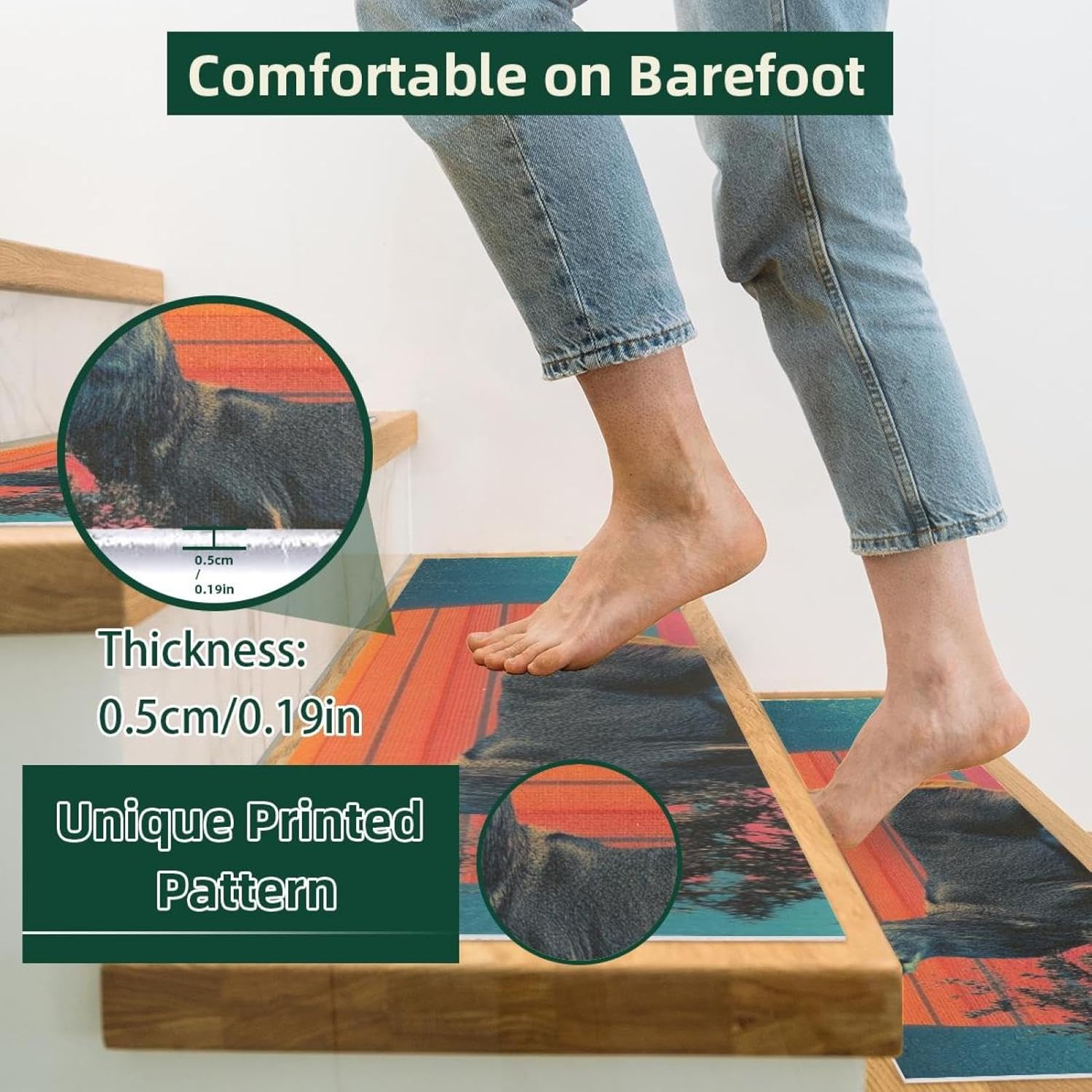・Size: 30 x 8 in / 76 x 20 cm, 5 mm thickness. ・Material: The polyester surface absorbs water, preventing stains on the floor. The TPE back is non-slip and water-resistant, preventing damage to the stairs. ・Package Contains: 15 pieces of 30x8in (about 76x20cm) stair mats, 5mm thick. Suitable for most needs. Each stairway treads rugs is individually wrapped. ・Easy to Clean: Vacuum, hand wash or machine wash. The stair runners for wooden steps can be machine washed, preferably hand washed, or vacuumed. Do not use bleach or tumble dry at high temperatures, drying at appropriate low temperatures will give you a comfortable texture. ・Noise Reduction of Stair Treads: By adding our stair runner, not only can you protect your floors, but you can also significantly diminish the noise caused by walking up and down the stairs. Stair rugs can decorate your stairs, create a warm home atmosphere, you can enjoy a peaceful and quiet home environment without disturbances. ・Easy to Remove Adhesive Backing: When you want to replace the stair treads non slip, the adhesive backing easily removes without leaving residue on the steps. ・Holiday Design: Stair carpet treads are designed specifically for Christmas,Halloween, Thanksgiving Day features classic festival elements and vivid printing styles,creating beautiful and stunning visual effects for you. This holiday themed stair treads can easily help you add a strong festive atmosphere, bringing charming and exquisite holiday decorations.