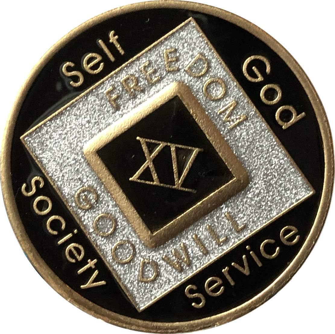Stunning 15 year Black and Silver Glitter Color NA Medallion with XV in the center. Size is 1 5/16" or 34x2mm This is an Official Narcotics Anonymous Medallion featuring raised 3D Graphics and Text back of the coin is black color. If it doesn't say NA on the back its not official.