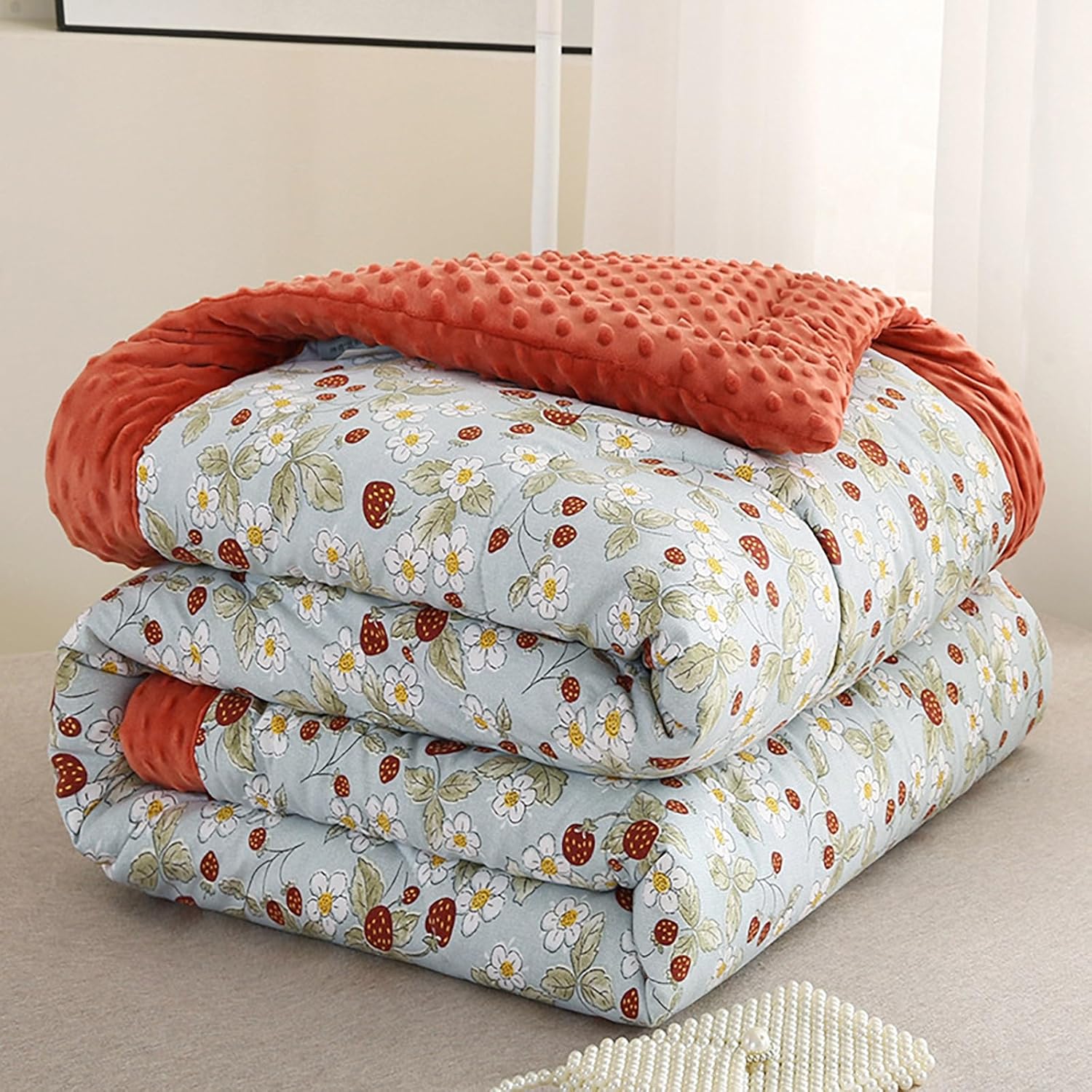 Product name: Washed cotton bean velvet quiltProduct process: Reactive printing and dyeingProduct fabric: A version washed cotton B version bean velvetProduct filling: soybean fiber fillingSize description:150x200cm air-conditioning quilt about 1.5kg150x200cm spring and autumn quilt about 2kg150x200cm winter quilt about 3kg