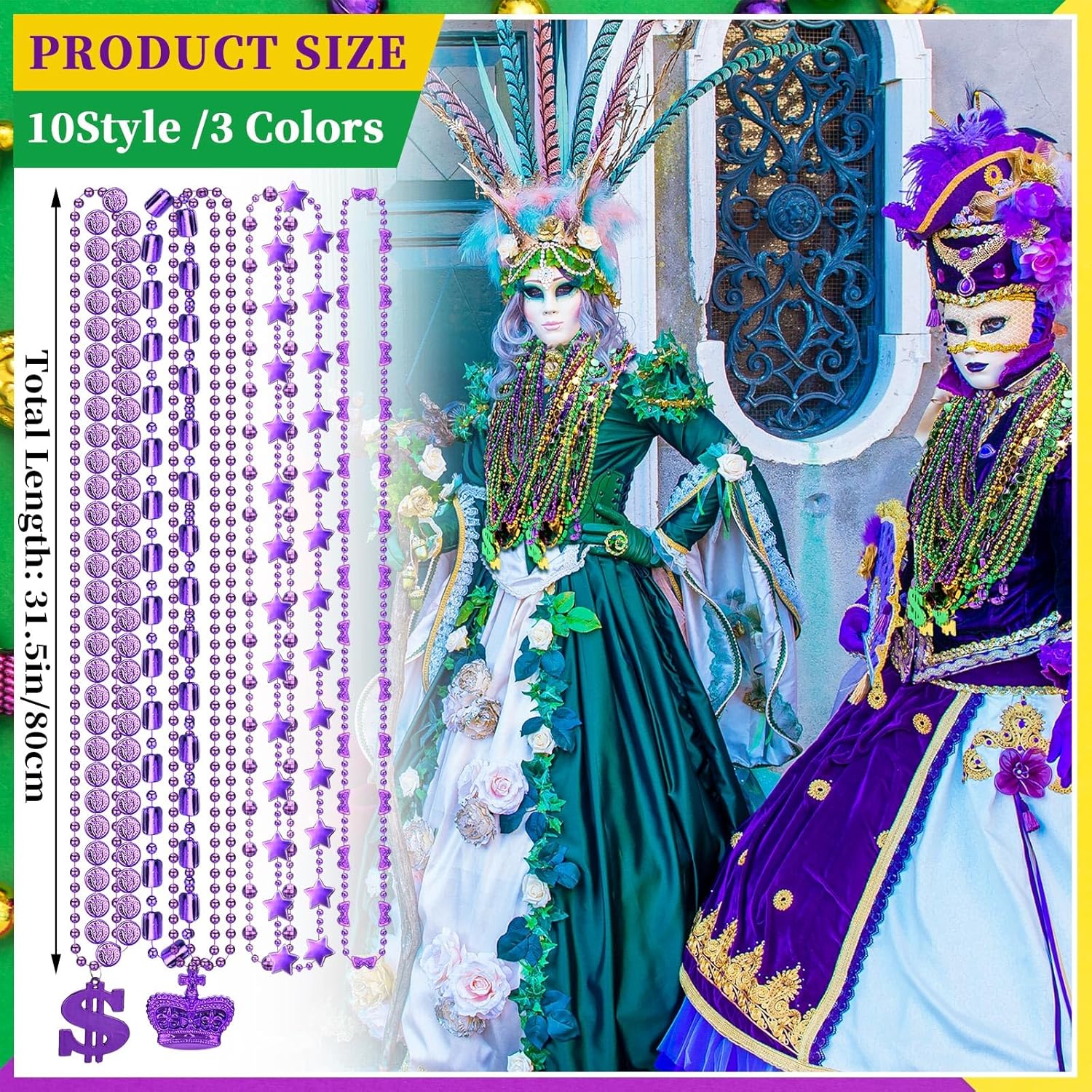 Features: Bulk Mardi Gras bead necklaces featuring ideal purple, green, and gold colors in assorted styles, designed for parade throws, costume accessories, and festive decorations Specifications: Bulk Material: plastic Color: purple, green, and gold Package includes: 1500 Pcs Notes: Manual measurement, please allow slight errors on size. The color may exist a slight difference due to different screen displays.