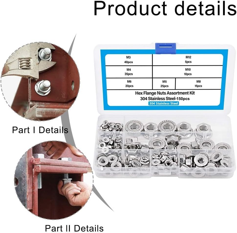 Product description Features:*Aienxn hexagonal flange nuts are made of 304 stainless steel, strong and sturdy.*Hex flange nuts are non-slip, easy to install and remove, and reusable.*These hexagon flange nuts are suitable for home, automotive and store use; hexagon flange nut kits are a great replacement for industrial and construction fasteners, and can also be used as an important accessory in your daily life.*There are 150pcs of 7 sizes of hexagon flange nuts, which are M3/4/5/6/8/10/12 different sizes can meet your different needs.*All flange nuts are packed in a plastic box for easy storage and carrying.Specifications:*Part Name: Hex Flange Nut*Material: 304 stainless steel*Box Size: 17x10x2cm*Color: silver*Quantity: 150pcs*Type: M3/4/5/6/8/10/12Package Content:3mm x 40pcs4mm x 35pcs5mm x 25pcs6mm x 20pcs8mm x 15pcs10mm x 10pcs12mm x 5pcsTotal: 150pcs x Hex Flange Nuts Manufacturer Contact Information no