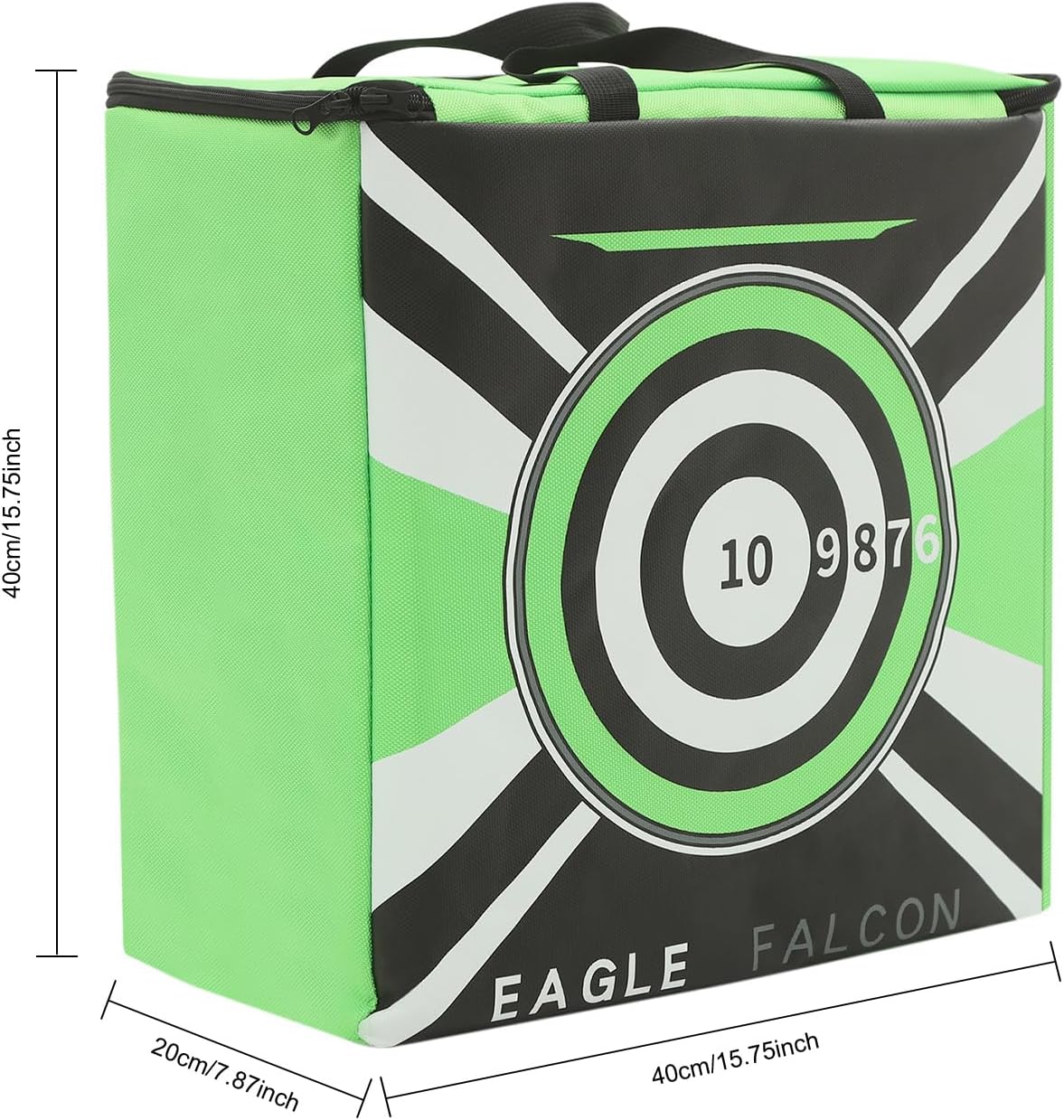 DetailsPractical Handles: They allow you to easily hang, move, and carry this product, enhancing the overall user experience.Dual Zipper Design: This design allows for quick replacement of the target face, which is convenient.SpecificationsMaterial: Oxford Cloth, Polymer Fiber, SpongeStyle: ModernShape: SquareColor: Black+GreenAssembly Required: NoMount Type: Floor Mount, HangingApplicable Occasions: Indoor and OutdoorApplicable Bow Type: <27kg/60 lbsProduct Size: 40*20*40cm/15.75*7.87*15.75inPackage Size: 42*42*22cm/16.54*16.54*8.66inGross Weight: 4.2kg/9.26 lbsNet Weight: 4kg/8.82 lbsPackage Included1* Archery TargetNotes1.Please check the product size before ordering to make sure it fits your needs.2.Please allow the slight color difference caused by the shooting light and 1-3cm error due to manual measurement, and make sure you do not mind before you order.
