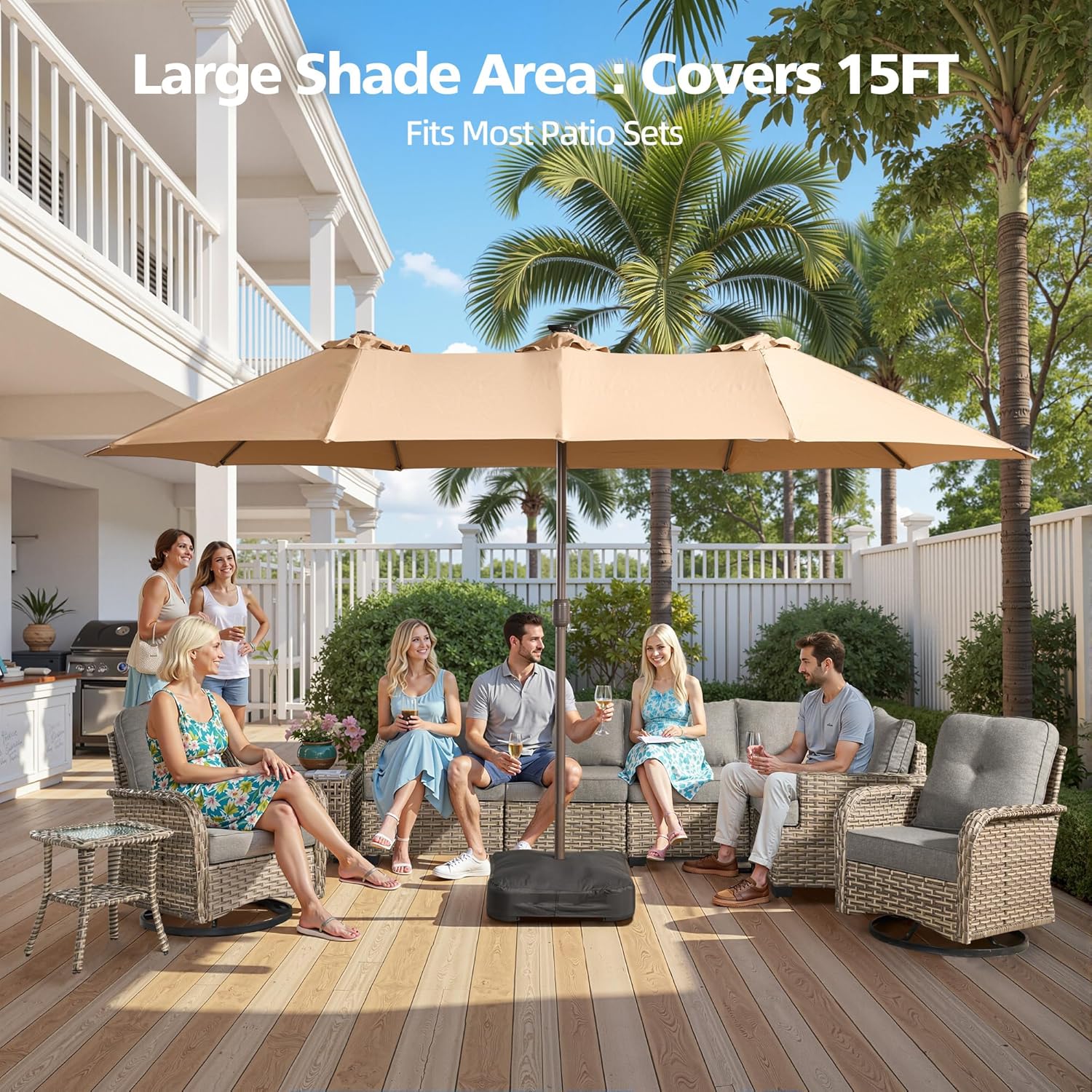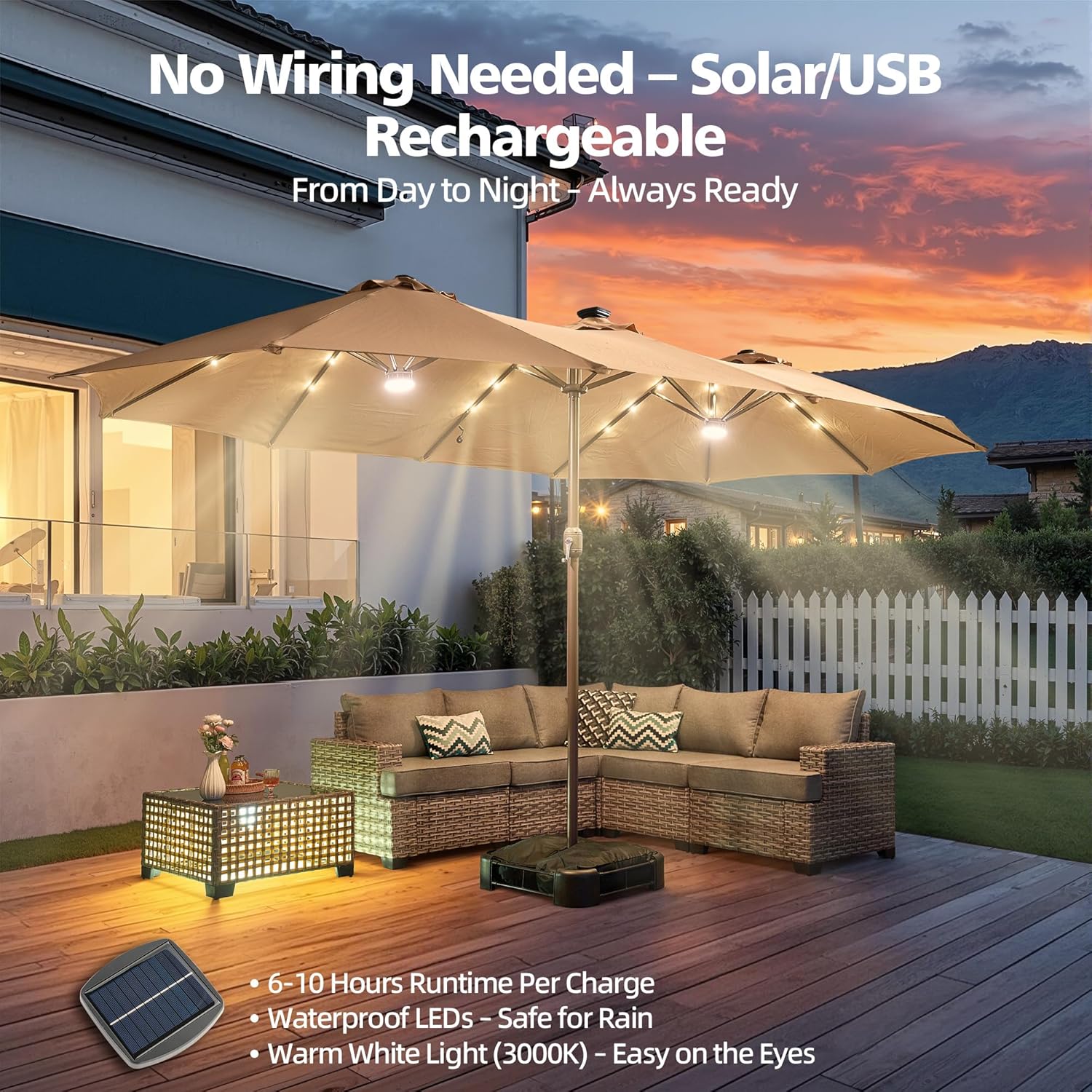 2× Integrated LED Lights – Equipped with energy-efficient dimmable LEDs (included) to illuminate your evenings. Perfect for nighttime pool parties, alfresco dinners, or backyard BBQs.Day-to-Night Functionality – Combines UPF 50+ sun protection by day and ambient lighting by night. Lights are weatherproof (IP44 rated) for rain-resistant performance.USB-Rechargeable – No wiring needed! Each light runs for 8-12 hours on a full charge (USB cable included).All Standard Features Included – Retains the 15FT double-sided shade, crank handle, and heavy-duty base for unmatched versatility.