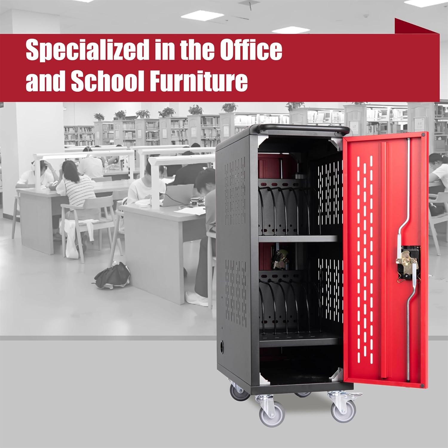 16 Bay Locking Charging Cabinet for Laptop, ChromebookThe 16 Devices Mobile Charging Cart and Cabinet is a versatile and efficient solution for managing and charging multiple devices. This laptop storage cart serves as a lockable charging station, ensuring the safety and security of your valuable devices. The sleek black&red design adds a professional touch to any environment.LOCK & KEYDoor lock at two side ensure tablet and laptopSide HandleThis product comes with a handle on one side, which not only helps to push and pull it more, but allows you to move it more freelyPOWER STRIPSUL certified power strips for quick charging connectionCASTERSUniversal casters make them quite enough and easy pushing. 2locking wheels keep cart in placeSpecificationMaterials: SteelCasters: with 3" non-marring casters (2pcs with brake and 2pcs without brake)Certificate of Power Strips: ULNet Weight: 46.96 lbGross Weight: 53.35 lbPACKAGE SIZE: 30.31"X22.83"X8.66"PRODUCT SIZE: 34.06"X20"X12.13"If you have any questions, please feel free to contact us.