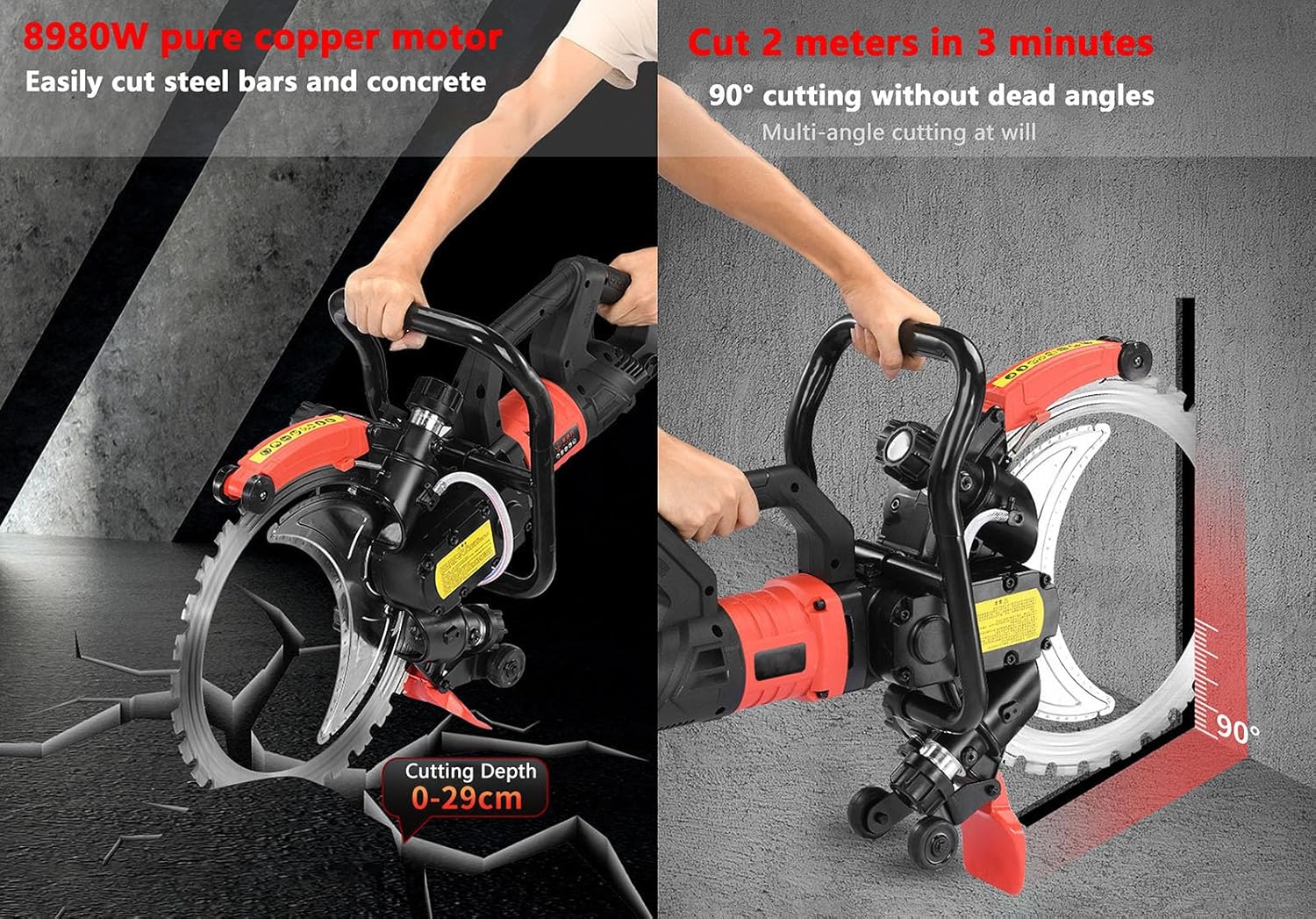 ★ FEATURES1.Electric wall groove cutting machine is suitable for cutting walls with a depth of 29cm/11.4″.2.Supports horizontal, vertical, and multi angle cutting, rapid prototyping, and no dead corners.3.The concrete circular ring saw is equipped with a high-frequency and high-power 8980W pure copper motor.4.Equipped with intelligent water pump and water cutting.★ Specifications:- Name: Circular Saw- Rated Power: 8980W- Maximum Cutting Depth: 29cm/11.81"- Blade Diameter: 41cm/16"- Rated Speed: 3000rpm- Power Cord: 2.5m- Weight: 16kg- Applicable Materials: Stone, Metal, Stainless Steel, Marble, Granite, Ceramic, Glass, Rubber, Foam★ Package Include:1*Electric Concrete Ring Saw1*Water Pump Set2*Saw Blades1*Manual