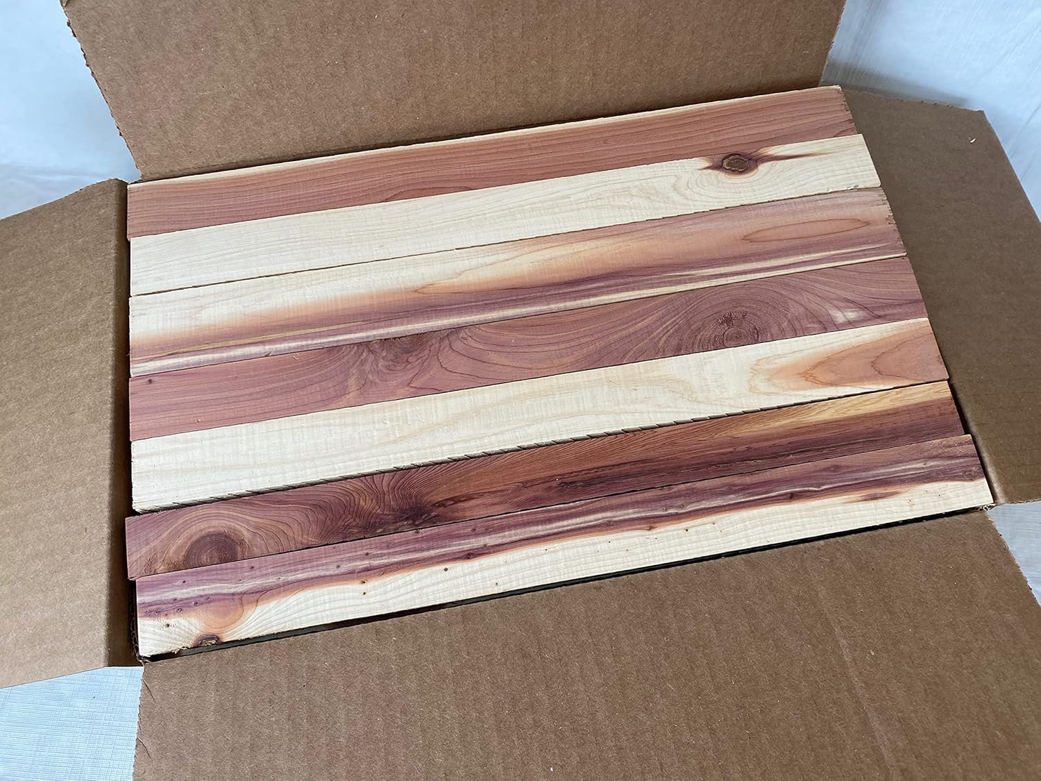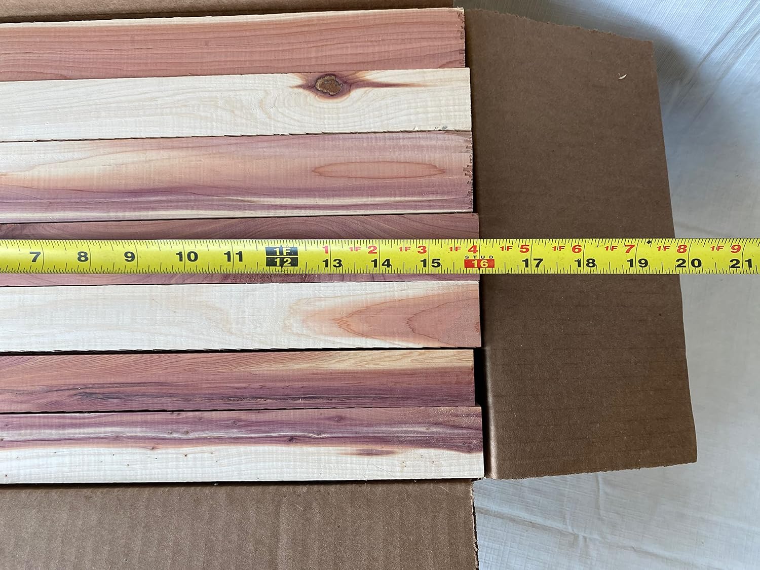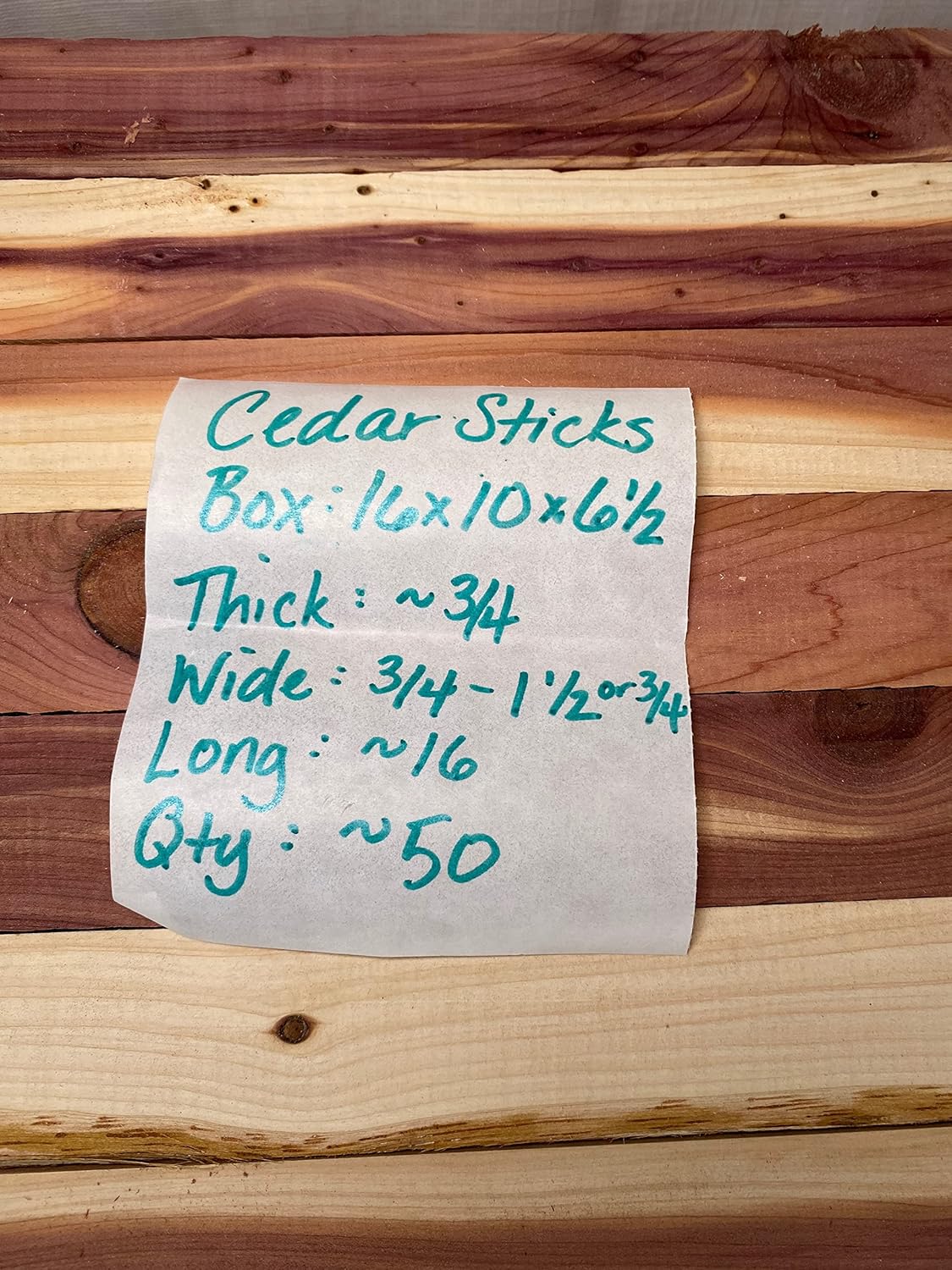 These are rejects from cutting board projects Each stick is about 16" long, 2 to 4 (most 2") wide, and 3/4" thick Mostly smooth, but some may be rough Kiln dry Aromatic red cedar Since these are rejects, there may be a dent, scrap, knot, bad edge, crack, etc….but LOTS of nice, usable wood