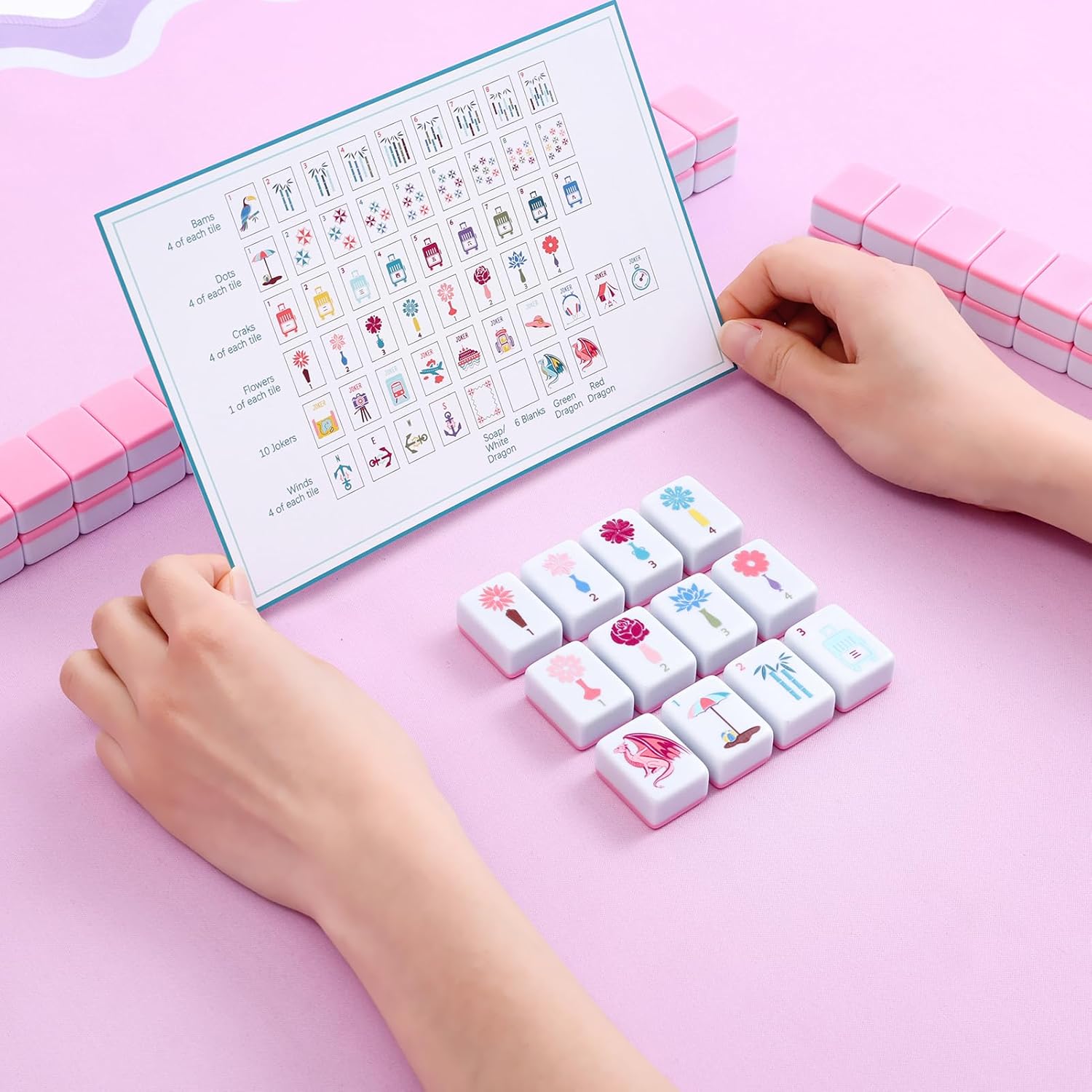 | Included Components | 160 Pink Printed American Mahjong Game Set with Carrying Bag and Accessories, 1.2’’ Mahjong Tiles Set |