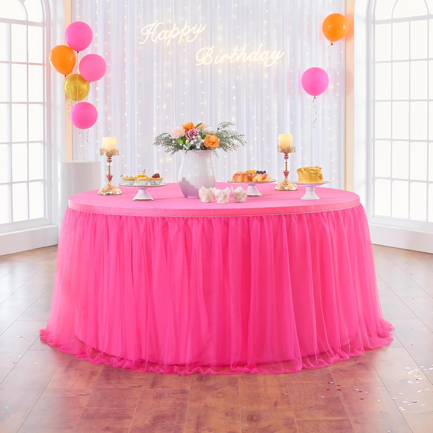| Included Components | 1 pcs 14ft/167inch fuchsia hot pink tulle tutu table skirt, With Velcro, Without Table Cover |