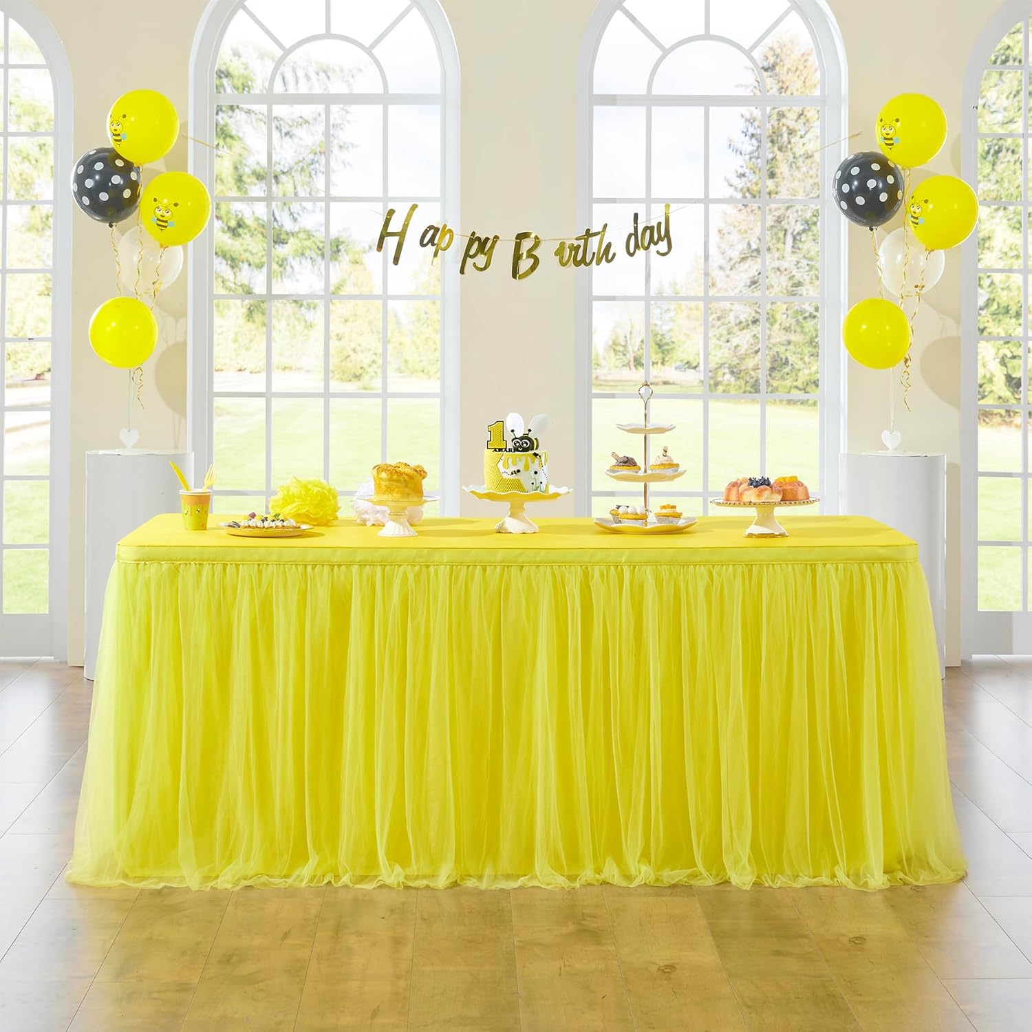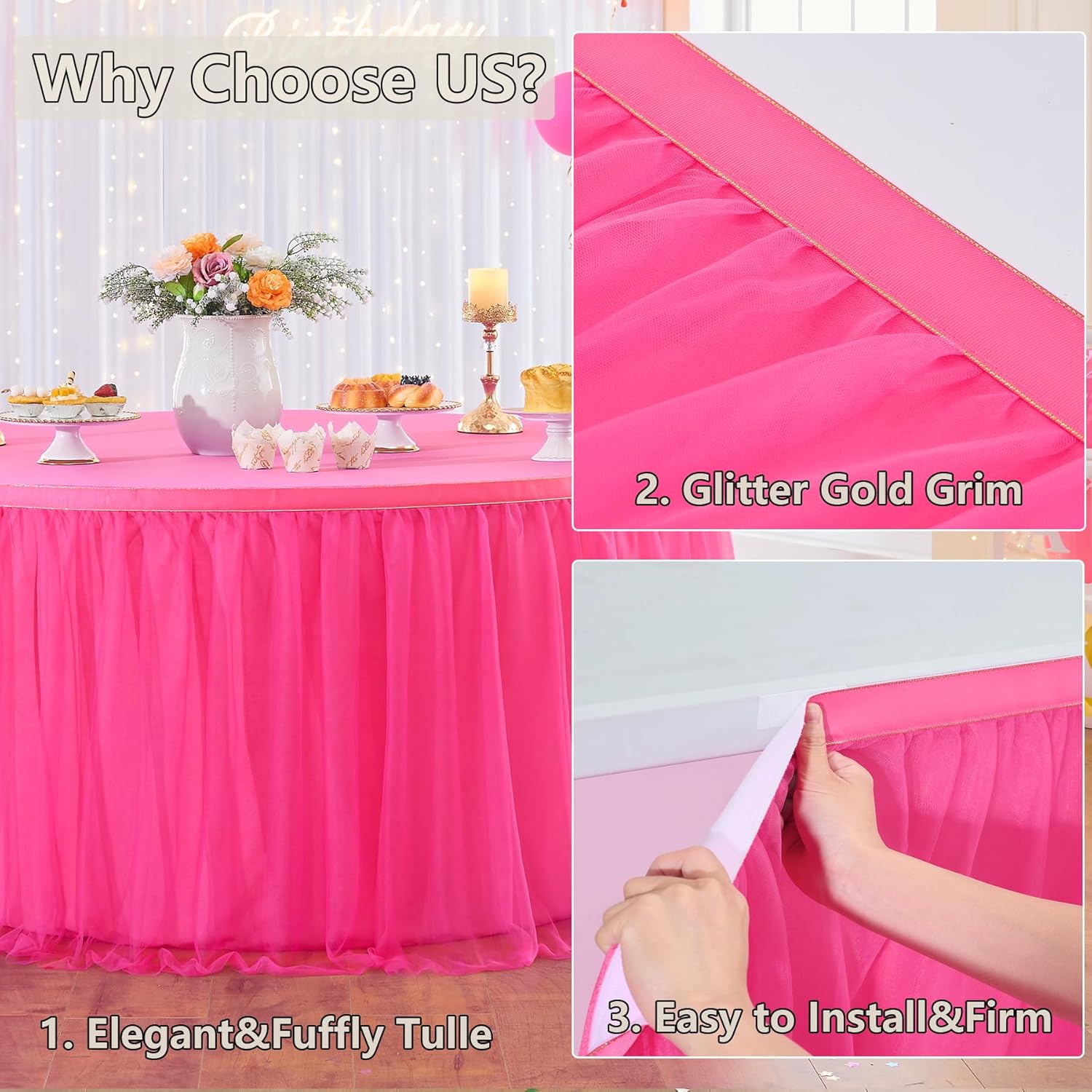 | Additional Features | Soft Pleated Wavy Fuffly Tulle, Glitter Gold Brim, 2 Layer Design, Washable Lining, Elegant Table Skirt |