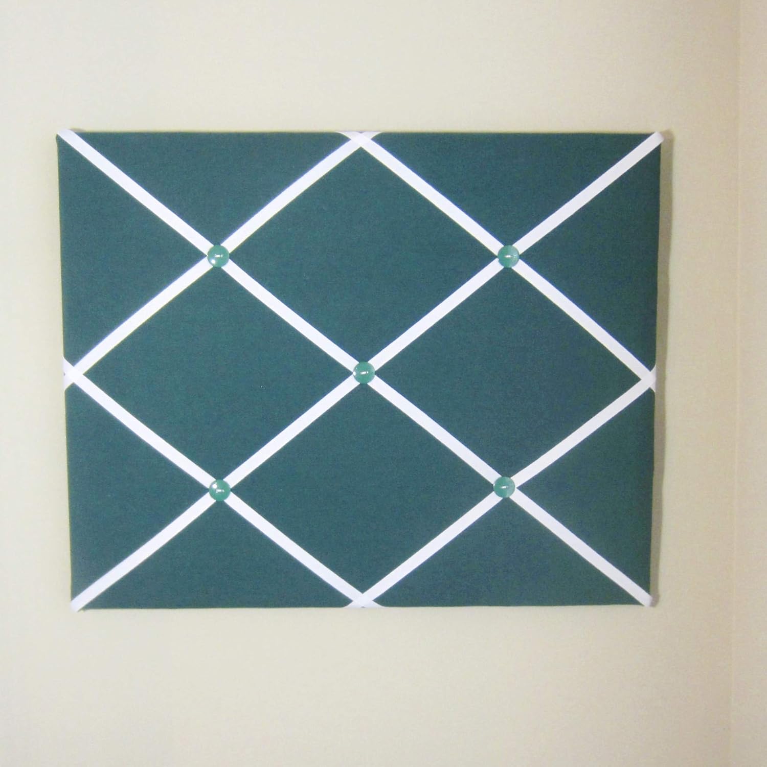 A 16"x20" memory board in hunter green fabric with white grosgrain ribbon and green buttons. This memory board or bow holder is perfect for a girl's room, kitchen or even a dorm room. Photographers and doctor's offices love to use these memo boards to display photos of their littlest clients. Handmade fabric memory boards are designed to be used without tacks or push pins. Great for: *Organizing photographs (your own or all those Christmas photo cards!) *Organizing business cards *Hanging hair bows or jewelry *Safely storing your household bills *Organizing the million slips of paper covering your desk! This memory board is made with designer fabrics and top quality materials. The back is finished with a felt back and ribbon. Each memory board has a saw tooth hanger on the vertical and horizontal sides.