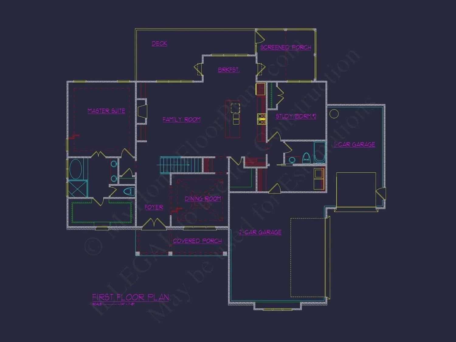 Width: 73′ 0″Depth: 63′ 5″Htd SF: 3,280Unhtd SF: 1,501Elegant 2-Story House Plan with Modern Transitional DesignExplore this elegant 4-bedroom Transitional house plan with 3,280 heated sq. ft., open floor plan, screened porch, and premium CAD blueprints included.This Transitional-style house plan offers a perfect mix of comfort and functionality. Designed for modern living, it delivers timeless charm and smart space planning.Key Features of the Home PlanLiving Areas - Heated & UnheatedHeated area: 3,280 sq. ft. across two spacious stories.Unheated extras: Screened porch, front covered porch, and outdoor deck space for gatherings.Bedrooms & Bathrooms4 generously sized bedrooms with split layout for added privacy.4 full bathrooms designed with convenience and luxury in mind.First-floor Owner Suite with a large walk-in closet (WIC) and direct access to private outdoor space.Interior HighlightsOpen floor plan with kitchen, great room, and breakfast nook flowing seamlessly. View open layouts.Butler's pantry adds functionality for entertaining and storage.Kitchen island for prep and casual dining. Explore kitchen island plans.Coffered ceilings and premium trim add upscale elegance to main living areas.Fireplace in the living room brings warmth and comfort. See fireplace designs.Dedicated study/office ideal for remote work or home schooling.Garage & Storage DetailsGarage Bays: 2-car garage with side entry for added curb appeal.Garage Type: Attached for convenience and weather protection.Storage: Ample space in mudroom cubbies and closets throughout the home.Outdoor Living FeaturesLarge screened porch for bug-free relaxation in warm weather.Rear deck area perfect for grilling and socializing.Covered front porch with elegant detailing for a welcoming entrance. See covered porch plans.Architectural Style: TransitionalThis design blends timeless materials and thoughtful