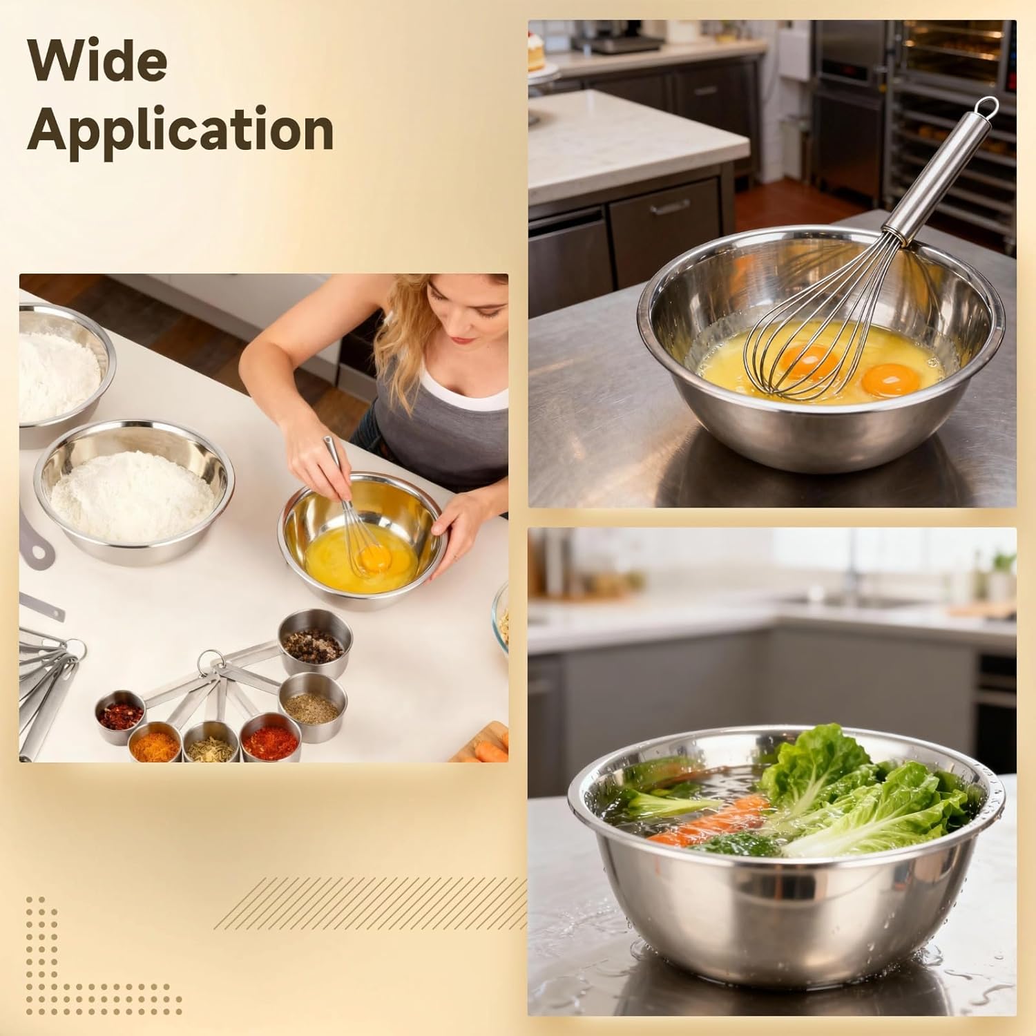 Color: Silver Material: Stainless Steel Size: Package Size: 12.2 in x 11.8 in x 5.5 in / 31 cm x 30 cm x 14 cm Package Includes: 3 x Mixing Bowl, 12 x Measuring Tool, 1 x Whisk, 1 x Egg Separator Note: - Please refer to the measurement. Tiny measuring error is allowable in normal range. - There might be a little color difference due to the monitor, camera or other factors, please refer to the physical item.