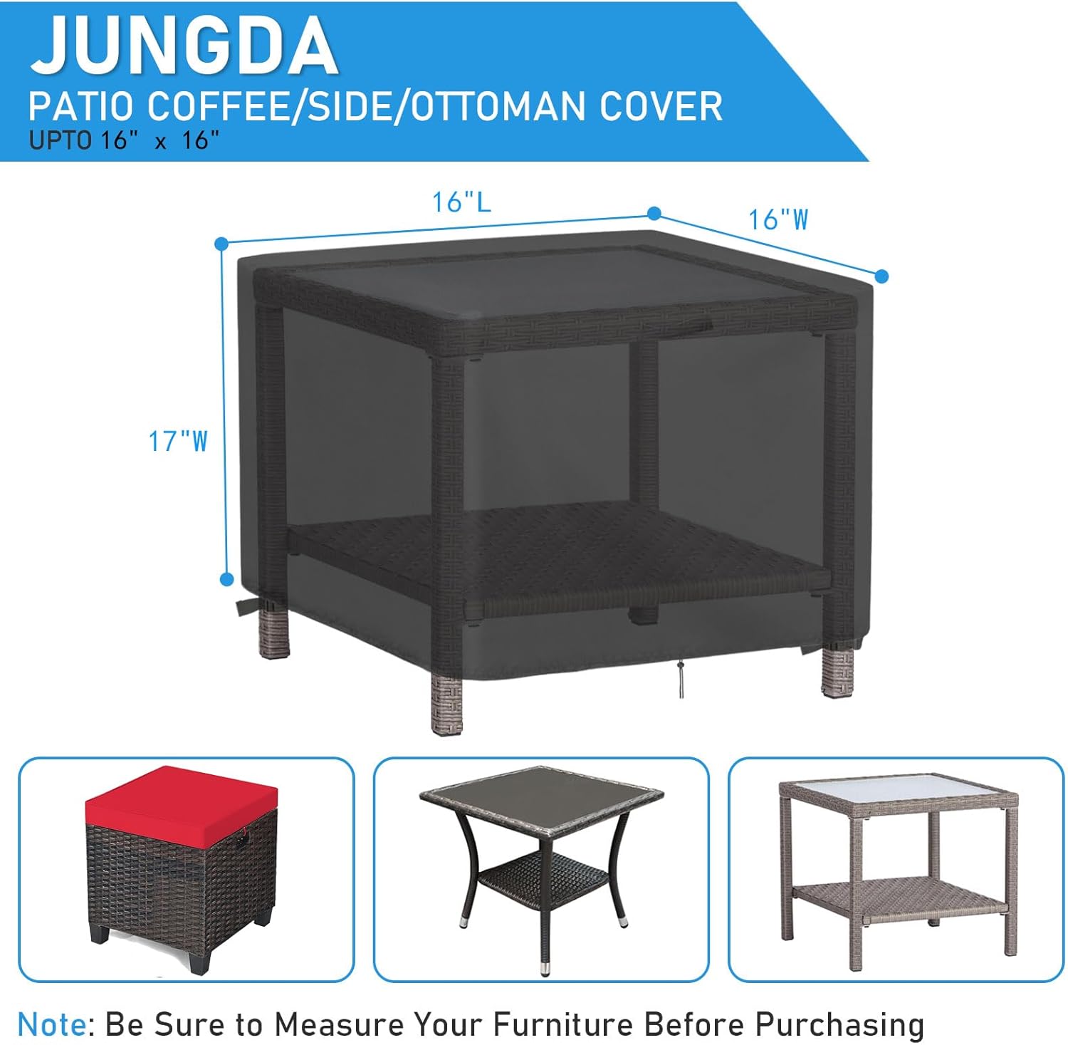 Specifications: Color: black Waterproof: YES Size:18"L x 18"W x 18"H/16"L x 16"W x 17"H Package Contents: 2 x Patio Furniture Cover Notes: Please Measure Before Purchasing For daily maintenance, please hand washing. No machines wash or dry clean. The cover is not fireproof. Please keep away from open flame and other sources of ignition.