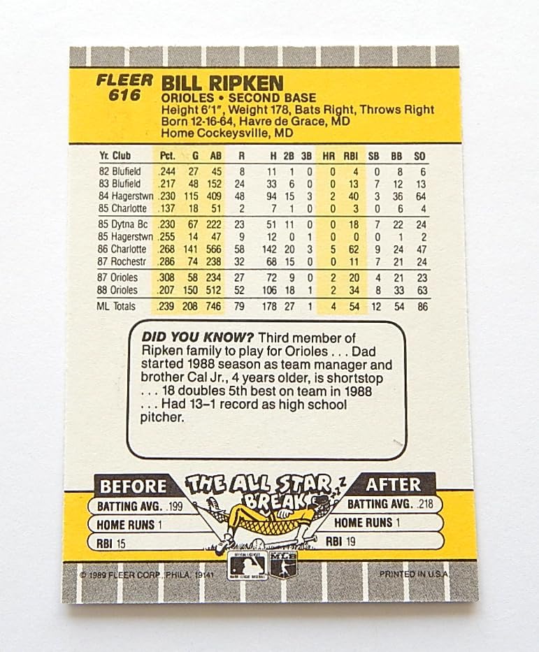 Add a legendary piece to your collection with the 1989 Fleer Error #616A Bill Ripken card, famously featuring an unintentional obscenity on the bat knob that made it an instant collector’s item. This unique error card is one of the most infamous in baseball card history, quickly becoming a sought-after gem among collectors and fans alike. It showcases Bill Ripken in his Orioles uniform, with an innocuous pose that contrasts with the surprising detail on his bat. This card is known for its rarity and the controversy surrounding it, leading to various versions as Fleer scrambled to censor it. Owning this card means holding onto a piece of sports card lore that has grown in popularity over the decades. Perfect for those looking to add something distinct and historically significant to their collection, the 1989 Fleer Bill Ripken error card is a classic symbol of the unpredictable world of trading cards.