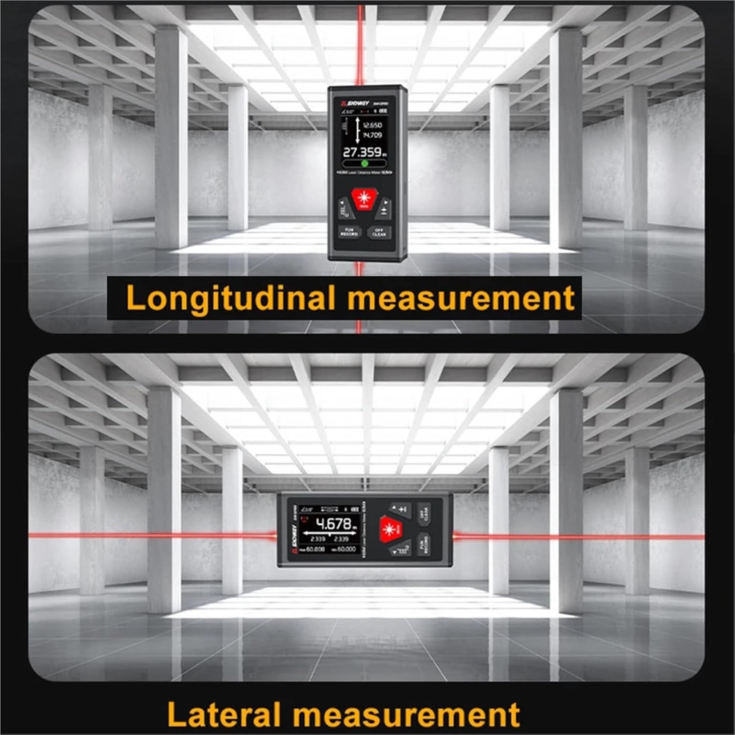 Distance Meters1: Accurately measure without moving or kneeling on the ground,it is very easy to operater.2: Dual distance meter can switch between bidirectional and unidirectional measurement3: distance meter can measure distance length, continuous measurement, area, volume and pythagorean measurement.4: Large Display, it also display multiple measurement units for meter /inch /Feet5: The backlight function allows you to read clearly in dark conditions6: Dual rangefinder is equipped with an electronic angle device that can help you quickly determine the horizontal direction8:Rechargeable battery(built-in) can support your day work.9: The back of the instrument is magnetic, so that theinstrument can be adsorbed on the metal surfaceSpecificationsMeasure range: SW-DR60 60m(unidirectional),120m(bidirectional)Measure range: SW-DR100 100m(unidirectional),200m(bidirectional)Accuracy:±(2mm+D*1/10000)Dip measuring range: ±90°Continuous measurement :yesArea/Volume measurement:yesWall area measurement:yesPythagorean measurement:yesAngle and height measurement:yesLength Addition and subtraction measurement:yesArea/Volume Addition and subtraction measurement:yesMax/min value:yesElectronic level bubble:yesAutomatic screen rotation:yesMagnetism:yes level: 2<;1mWMax storage:100 unitsUnit setting: meter,feet,inchAuto off: 20sAuto power off: 180sBacklight time: 60sBattery: 3.7V 850mAh Li-ionCharging: DC5V 0.75A Type-COperation times at full charger: 12000 times (unidirectional),8000 times (bidirectional)Storage temperature:-20°C to 60°CWorking temperature: 0°C to 40°CStorage humidity: 20%-80%RHProduct size: 115*50*24.5mmPackage contents1* distance meter1*Pouch1*Strap1*Manual1*Type-C cable1*Box==========Power Type : RechargeableSize : 115*50*24.5mmModel Number : SW-DR60/SW-DR100/SW-DG60/SW-DG100Measurement Accuracy : +/-2mm Model : DR60/DR100Dip measuring range : +/- 90 degreeMeasuring range1 : 60m(Unidirectional) 120m(Bidirectional)Continuous measurement : YesArea/Volume measurement : YesPythagorean measurement : YesAngle and height measurement : YesMax/Min value : YesElectronic level bubble : YesAutomatic screen rotation : YesMagnetism : Yes