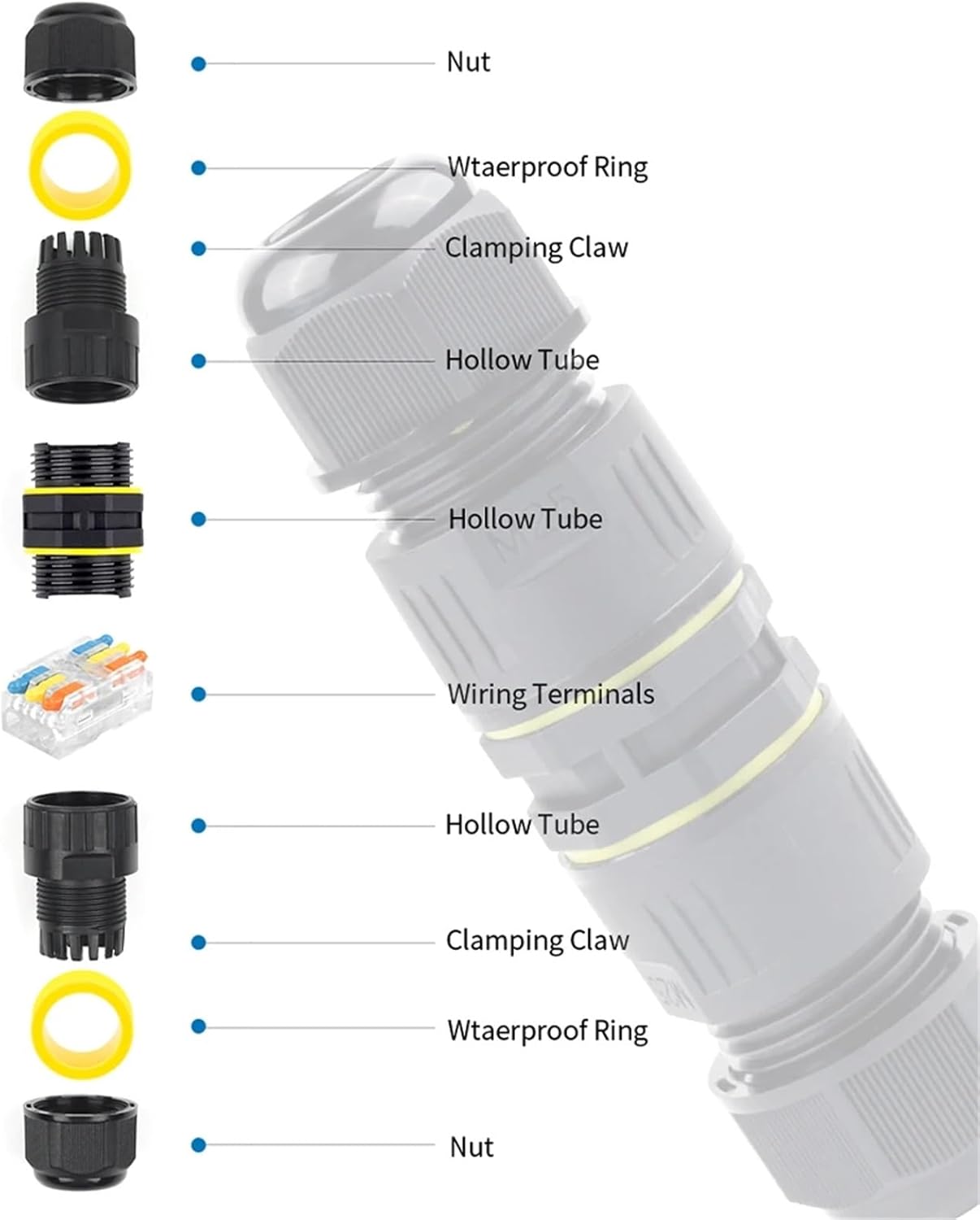ConnectorsProducts name : Waterproof outdoor Connector junction box Material : Nylon PA66 flame-ratardant,Silica-gel Rubber ring Connect Type: M25 Straight Type 2/3 Pin Mini Quick Connector Waterproof level : IP68 Wire range : Ø5-8mm/9-12mm/10-14mm ,suit for most usually power cord Wiring range: 0.08-2.5(4.0)mm² Rated voltage: 400v Rated current: 25A Wide Usability : The electrical junction boxes Suitable for kinds of LED billboards, tunnel lights, Road landscape lighting,outdoor display, garden electrical lights external .Further applications in coastal, river, sea or underwater engineering, underground engineering, mining engineering, solar-wind power, solar water heaters, various machinery and equipment.==========Model Number : IP68 M25 Straight Type with Quick connectorVoltage : 380V