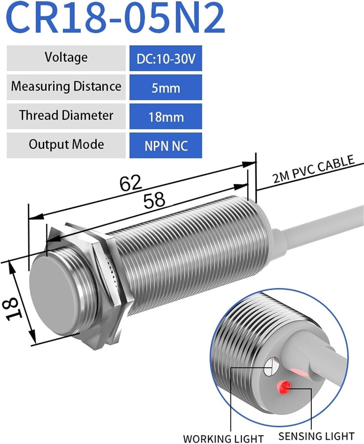 TransducersTheory : Capacitance SensorModel Number : CR18-05N1Material : MetalOutput : Switching TransducerUse : Position SensorSensing distance : 5mm/10MMAssured distance : 0-4.5mm/9mmProtection degree : IP 65Switching frequency : 500HzConnection : 2m PVC CableSupply voltage : 6-36VDC 3-WiresTheory : Self-inductionSensing surface diameter : 18mm