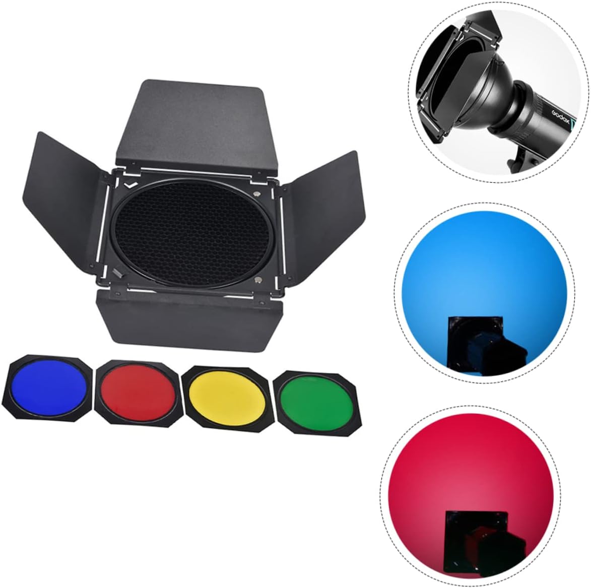 Package List 1 x four- barrier 1 x honeycomb cover 4 x color filters Features -Honeycomb cover diameter: About 17.5cm/6.89inch photography lamp color filter. -Size Four- barrier: About 40.00X40.00X1.00cm/15.72X15.72X0.39inch photography lamp parts. -Material: Alloy photography light accessory. -Color: Assorted Color special photography lamp baffle. -Note: suitable for 18CM photography light flash lamp lampshade accessories flash lamp baffle. -Size color filter: About 17.8x17.8cm/7.01x7.01inch practical photography lamp parts. -Fine craftsmanship, texture, creative and simple look, very practical simple photography lamp baffle. -Can be used for 18CM photography light flash lamp lampshade accessories stylish photography lamp accessory. -Easy to install and remove, very practical and durable flash light accessory. -It can the light to a certain range, and can play various colors as you like photography lamp baffle. -Made of and study material, very durable and not easy to damage photography reflective shade.Goods Descriptionflash lamp accessories If you are looking for a professional and practical photographic barrier, then you miss our product.practical photography lamp parts It can the light to a certain range, and can play various colors as you like.simple photography lamp baffle Mainly made of and sturdy alloy material, very sturdy and durable