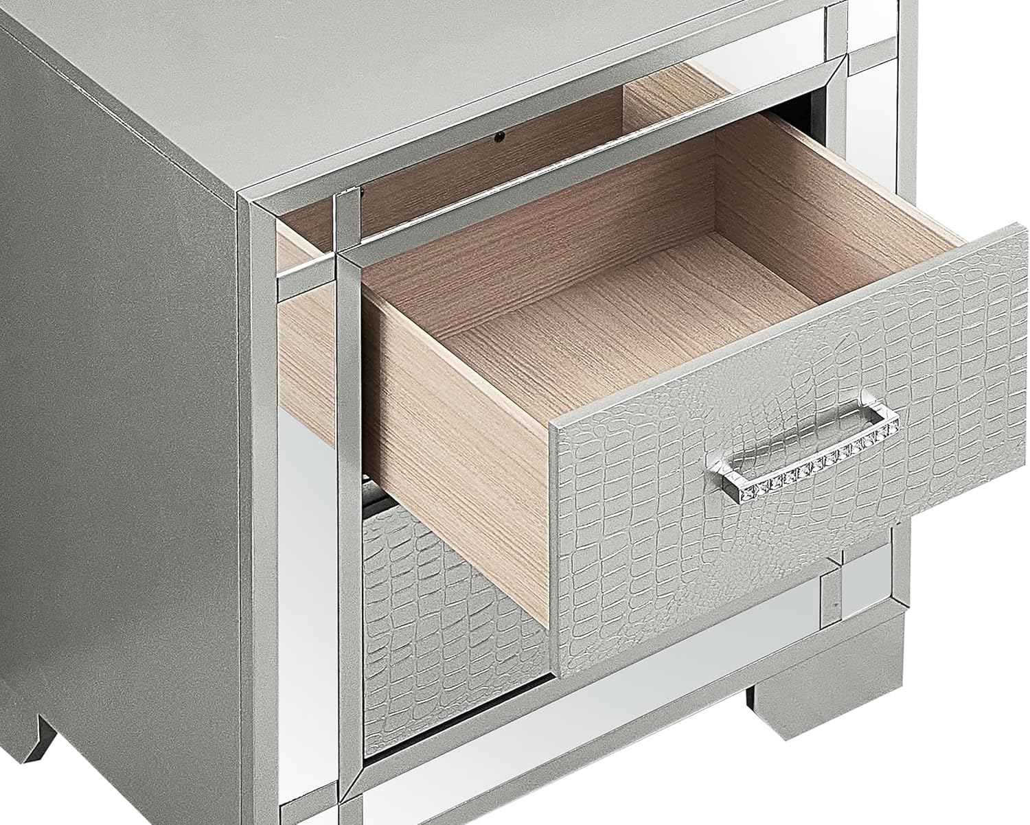 Product Type:General ItemProduct Name:Glory Furniture Madison G6600-N , Silver ChampagnePlace of Origin:MalaysiaMain Color:ChampagneMain Material:Particle BoardProduct DimensionsAssembled Length (in.):23.00Assembled Width (in.):17.00Assembled Height (in.):26.00Weight (lbs.):44.00Package SizeLength (in.):20.00Width (in.):26.00Height (in.):28.00Weight (lbs.):49.00Product FeaturesUnique Croc Textured Finish is Embossed In Real Wood on Dovetailed DrawersMirror Accents on Front Add Glam to you RoomPre Attached Faux Jeweled Handles are Used to Further Add to The "Glam" DesignCenter Mounted Metal Drawer Guides and Corner Blocked Bottoms for Additional Support