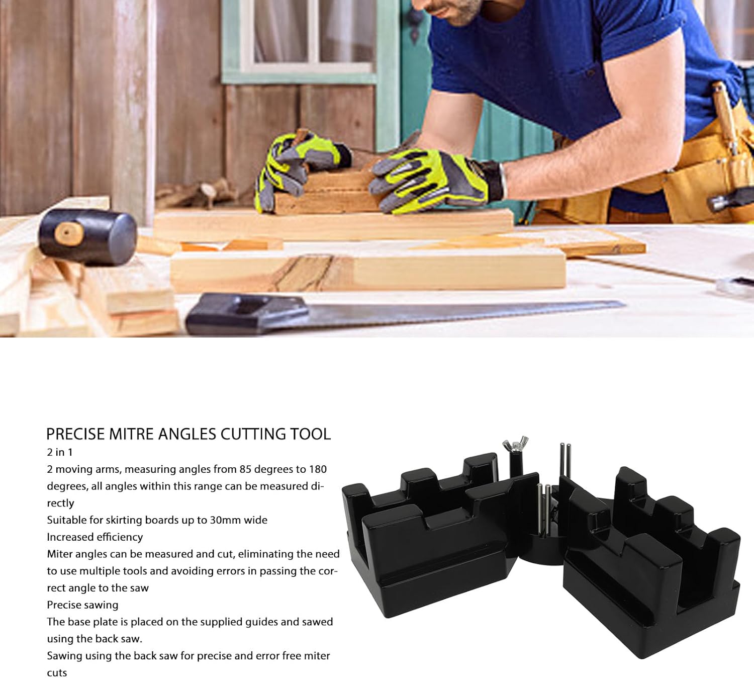 Item Type: 2 in 1 Mitre Measuring Cutting ToolProduct Material: ABS, PC, Stainless SteelPackage List:1 x 2 in 1 Mitre Measuring Cutting Tool