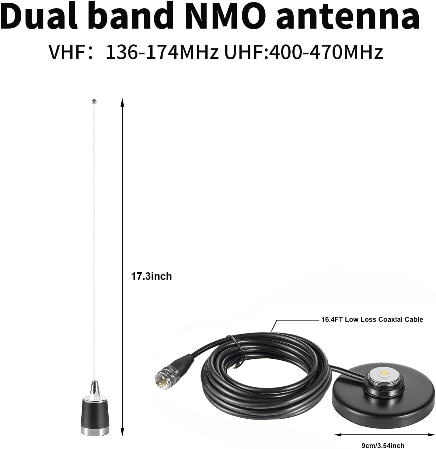 Upgrade your mobile radio communications with this Eifagur dual band antenna system. Designed for vehicle mounting, this versatile antenna operates on both 144MHz (2M) and 430MHz (70cm) UHF/VHF frequencies, making it ideal for two-way radio enthusiasts and professional users alike. The package includes a robust NMO magnetic base mount for secure attachment to your vehicle's trunk or roof, paired with a generous 16.5-foot cable terminated with a UHF PL259 male plug for easy connection to your mobile radio transceiver. The antenna's dual-band capability ensures excellent reception and transmission across multiple frequency ranges, while the magnetic mount allows for quick installation and removal when needed. Perfect for mobile radio operators who demand reliable performance and convenient installation in their vehicle-based communications setup.