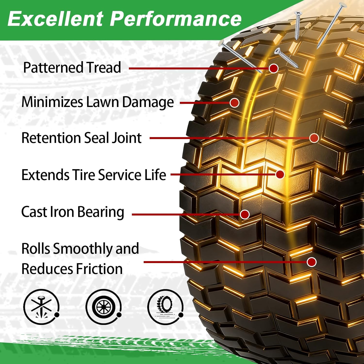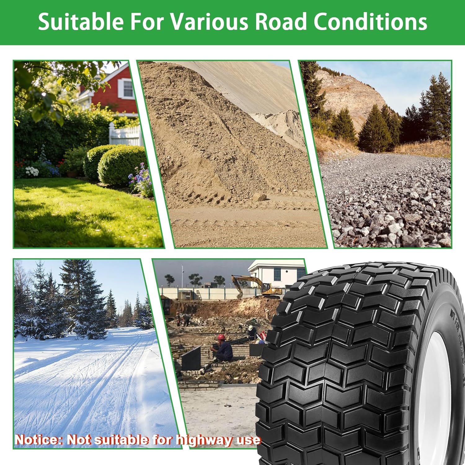 Specs : Tire Diameter: 13" Tire Width: 6.26" Rim Diameter: 6" Bore ID: 3/4" ;Centered Hub Length: 3" Package Includes: 2 x 13x6.50-6"LAWN MOWER TIRE Applicable Models 13x6.50-6 Tubeless Front Tire for golf carts, utility vehicles, and riding lawn mowers (Not for highway use)