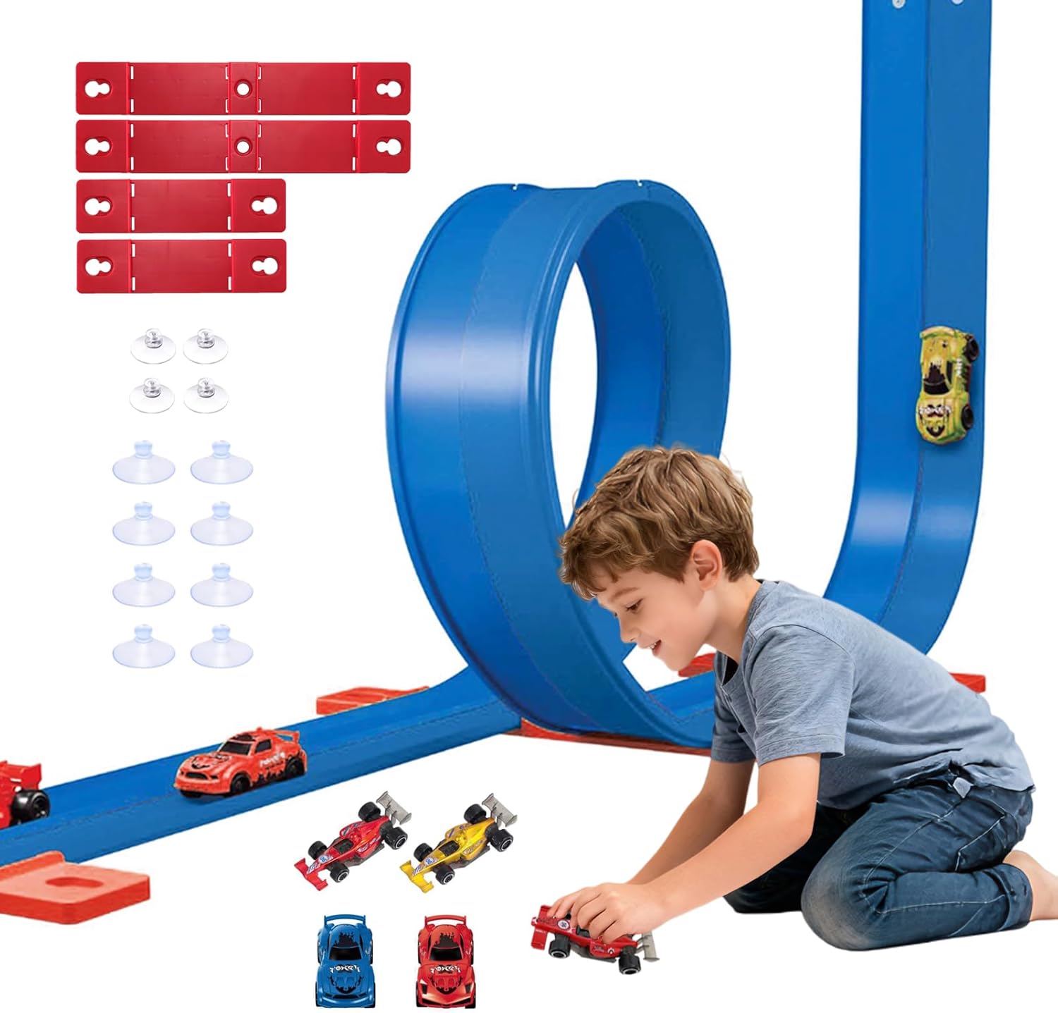 Why choose our flexible track toy? The Perfect Gift for Kids Who Love Speed, Creativity, and Adventure! The Flexible Race Track isn’t just a toy—it’s the ultimate gift that sparks creativity, excitement, and nonstop adventure. With 19.7 feet of flexible, bendable track and powerful suction cups, the Flexible Race Track adheres securely to various surfaces. It's Compatible with Hot Wheels and Matchbox cars, it transforms any room into a custom raceway. Proudly Made in the USA and requiring no assembly, it’s a hassle-free present that delivers big thrills right out of the box. Whether it’s for a birthday, holiday, or just because, the Flexible Race Track is the gift kids can’t stop playing with—and gift-givers can feel great about giving. What's in the package? 2 Pack 19.7ft Blue Track 8 x Race Cars 8 x Red Track Fixer 16 x Mushroom Head Suction Cups 8 x Screw Suction Cups Notes: Manual measurement, please allow slight errors on size. The color may exist a slight difference due to different screen displays.