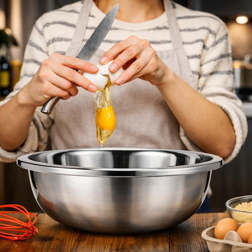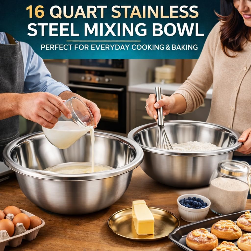 This 2-pack of large mixing bowls delivers professional-grade performance for both home kitchens and commercial settings. Each bowl features a generous 16-quart capacity, providing ample space for mixing large batches of dough, tossing salads, marinating meats, or preparing ingredients for your favorite recipes. Constructed from premium 304 stainless steel, these bowls offer exceptional durability and resistance to rust, stains, and corrosion. The polished mirror finish not only adds a sleek, professional appearance to your kitchen but also makes cleanup effortless. The flat base design ensures stability during vigorous mixing and prevents tipping, while the wide rim provides a comfortable grip for easy handling and pouring. These versatile bowls are perfect for baking enthusiasts, meal prep professionals, and anyone who needs reliable, spacious mixing vessels. The stainless steel construction maintains its appearance over time and won't retain odors or flavors from previous uses, making these bowls ideal for a variety of culinary tasks.