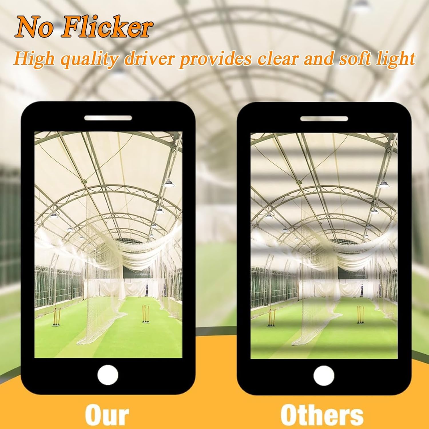 Product SpecificationsLight source: LEDColor temperature: 6500K (cool daylight)Input voltage: AC 120–277VMounting: Chain or rod (included)Beam angle: 90°Power factor: > 0.95Ingress protection: IP65 (dustproof & waterproof)Typical applications: Workshops, factories, warehouses, supermarketsCertification: CEModel details100W Power / Efficacy: 100 W, 180 lm/W → ~18,000 lmSize: Ø 9.84 in × H 5.51 in (Ø 250 mm × H 140 mm)Weight: 3.53 lb (1.6 kg)150W Power / Efficacy: 150 W, 180 lm/W → ~27,000 lmSize: Ø 11.81 in × H 5.51 in (Ø 300 mm × H 140 mm)Weight: 4.19 lb (1.9 kg)200WPower / Efficacy: 200 W, 180 lm/W → ~36,000 lmSize: Ø 13.58 in × H 5.51 in (Ø 345 mm × H 140 mm)Weight: 5.36 lb (2.43 kg)Note: Actual product may vary slightly from images due to monitor settings and lighting; photos are for reference only.