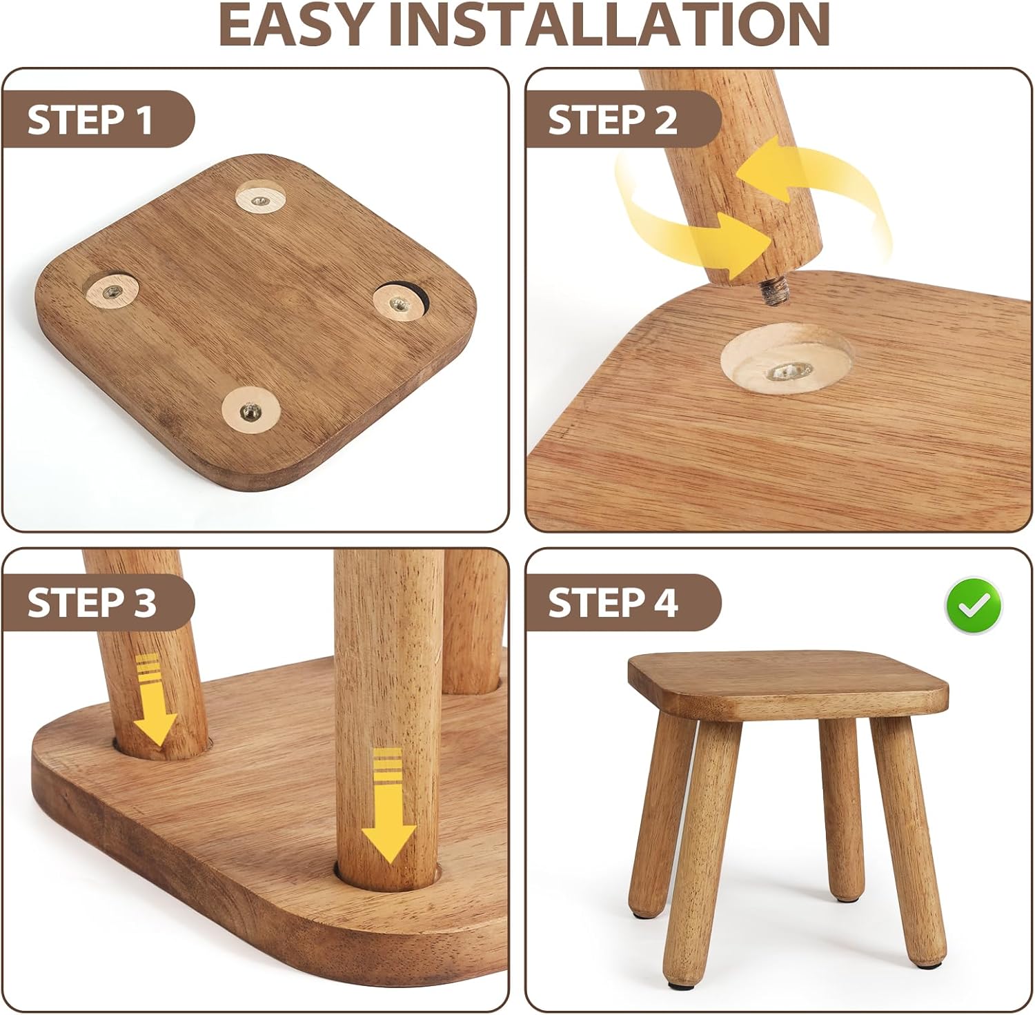 Product Description:This product is for use by children over 48 months old only. Introducing the VZZNN Classic 9.3-inch Wooden Stool, a versatile and elegant addition to your home. This stool comes as a pack of two, making it an excellent value for money purchase. Crafted from solid construction wood, it boasts a rich hardwood grain that gives it a timeless and sophisticated appearance, blending seamlessly with any home decor. Perfect for both adults and toddlers, this stool measures 9.3” X 9.3” X 9.3”, making it an ideal match for a children’s table. Its compact size ensures easy storage and portability, while its lightweight design allows you to move it around with ease. Whether you're using it indoors or outdoors, this stool provides a sturdy and reliable platform. Safety is our top priority, and we've designed this stool with that in mind. The round corners and four legs with foot pads provide additional stability and protection, ensuring that both children and your floors remain safe. The foot pads also prevent scratches and marks on your flooring, preserving the beauty of your home. The VZZNN Classic Wooden Stool is not just limited to one use. Its multifunctional design makes it perfect for a variety of purposes. Use it as a kid's step stool to help them reach higher areas, a footstool for relaxing, a little seat for the kids during story time, a reading stool for your favorite book, a game stool for board game nights, a shoe-changing stool in your entryway, or even as a plant stand to display your greenery. Its versatility ensures that it can be placed in various scenes around your home, providing temporary convenience wherever needed. Assembling this stool is a breeze. It requires no tools and can be put together in minutes. Simply screw the four legs into the threaded drilled holes under the platform, and you're done. The easy assembly process means you can start enjoying your new stool right away, without any hassle. At VZZNN, we pride ourselves on offering premium products and exceptional customer service. We stand by the quality of our products and are committed to ensuring your satisfaction. If you have any quality issues or are dissatisfied with your purchase, we will always provide positive solutions and address them promptly. Your shopping experience in our store is our top priority, and we strive to make it as pleasant and seamless as possible. Upgrade your home with the VZZNN Classic 9.3-inch Wooden Stool. Its elegant design, versatility, and easy assembly make it a must-have for any household. Whether you're looking for a convenient step stool for your kids, a stylish footstool for yourself, or a multifunctional piece of furniture that can be used in various ways, this stool is the perfect choice. Don't wait – order yours today and experience the convenience and elegance of the VZZNN Classic Wooden Stool! Feel free to reach out to us if you have any questions or need further assistance. We're always here to help and ensure you have a positive shopping experience with us.