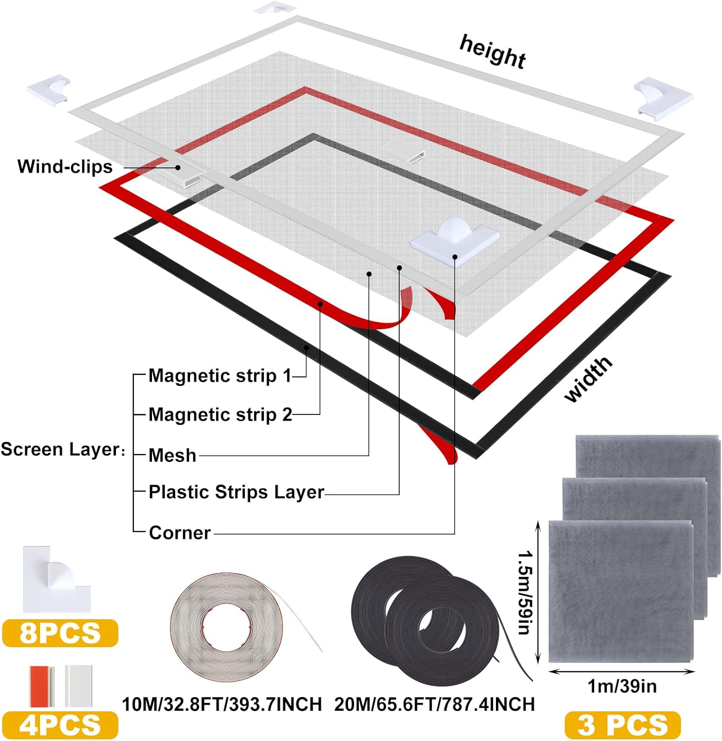 Features: The usage method of our adjustable magnetic window screen mesh is simple and straight-forward. Whenever required, just remove the screen from the window, rinse thoroughly, and then let it dry before reattaching it back to the window. This ensures the net is clean and long lasting. To ensure our magnetic DIY window mesh screen kit fits your window correctly, make sure to measure your window before ordering. This extra step will ensure that your window screen fits well, bright indoor living experience you deserve. Specifications: Material: Net: fiberglassColor: as shownSize: Net: 59'' x 39'' PVC Stripe: 32.8 ftMagnet Stripe: 65.6 ft Package includes: 3 x Net1Roll PVC stripe 1 Roll magnet stripe: 12 x AccessoriesNotes: Manual measurement, please allow slight errors on size. The color may exist a slight difference due to different screen displays.
