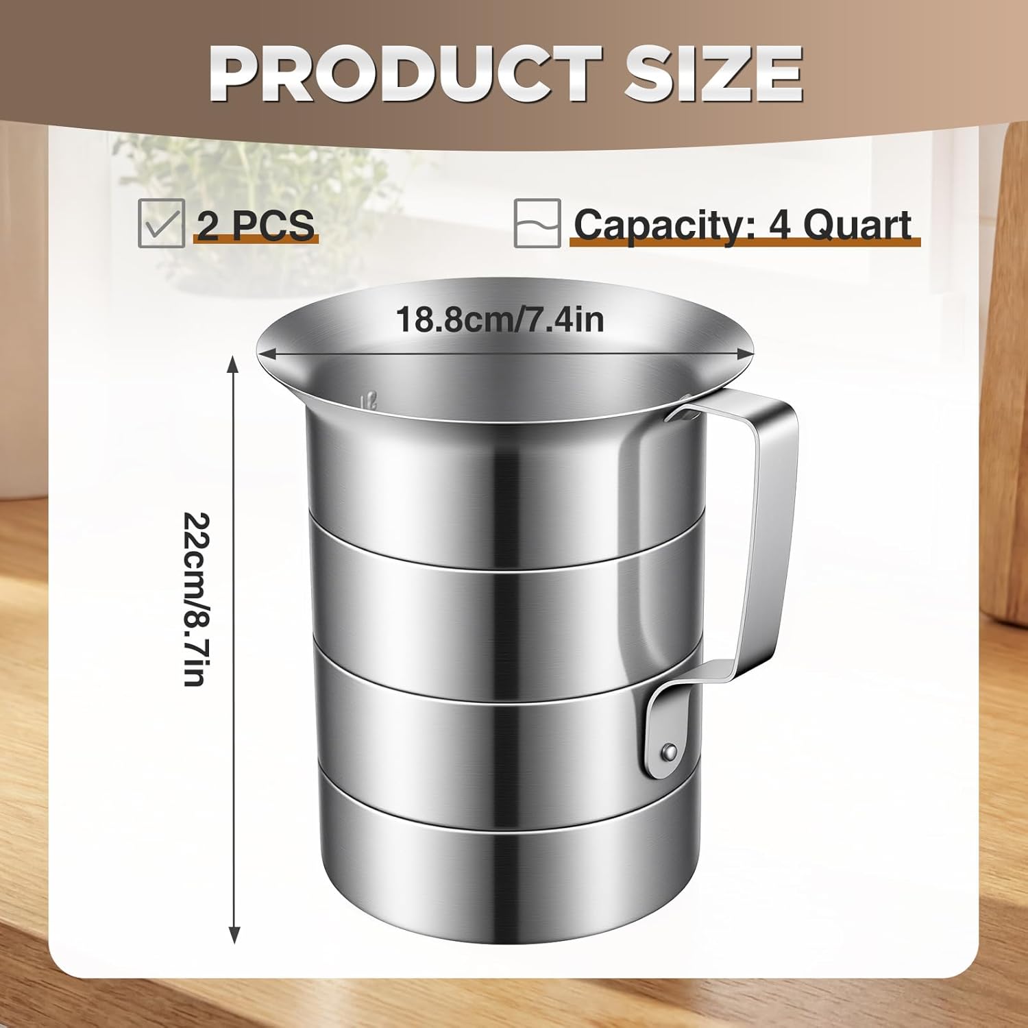 Features: This aluminum measure cup can be applied for a range of wet and dry ingredients common in kitchens. It works for liquids such as oils, water, and milk, as well as dry goods like flour and rice. This makes it a functional kitchen baking tool for various tasks from measuring liquid ingredients to portioning bulk items. The design and construction of this 4 Quart Aluminum Measure Cup make it applicable for different environments. Its functional features are useful in home kitchens for baking and cooking. The aluminum material and capacity also make it a consideration for other settings where measuring larger volumes is needed. Specifications: Material: Aluminum Color: sliver Size: The capacity is 4 quart Package includes: 2 X 4 Quart Aluminum Measure Notes: Manual measurement, please allow slight errors on size. The color may exist a slight difference due to different screen displays.