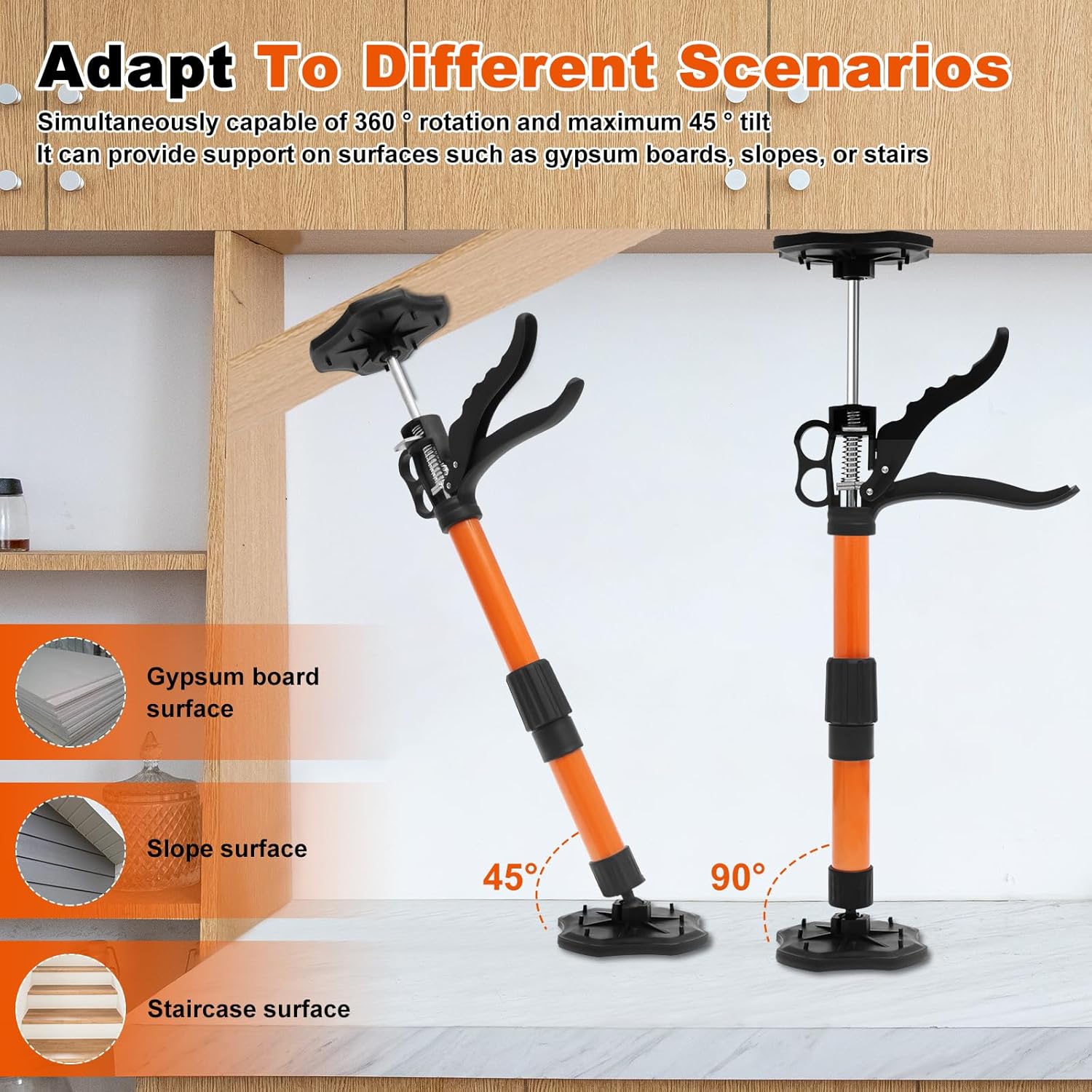Product description Detailed description: Specifications:This cabinet support pole features an adjustable height design , suitable for various installation scenarios . It is sturdy and enduring , easy to install , and suitable for both beginners and professionals . It is safe , nonslip , and easy to hang .Features:【Convenient Hook】Built in hooks allow for convenient hanging storage , combining portability with home tidiness .Product Name: Cabinet Support PoleMaterial : Steel + PlasticSize : Adjustable height 35-60 cm (13.8×23.6 inch) ; Base and top size : 11.5×11.5 cm / 4.5×4.5 inchColor : OrangeNote:1. There may be slight differences between the picture and the actual color of the commodity. We will try our best to show you the exact color.2. Please allow slight dimension differences due to manual measurement. Parts List: 2×Adjustable Support Rod 2×Replacement Base Head Manufacturer Contact Information no