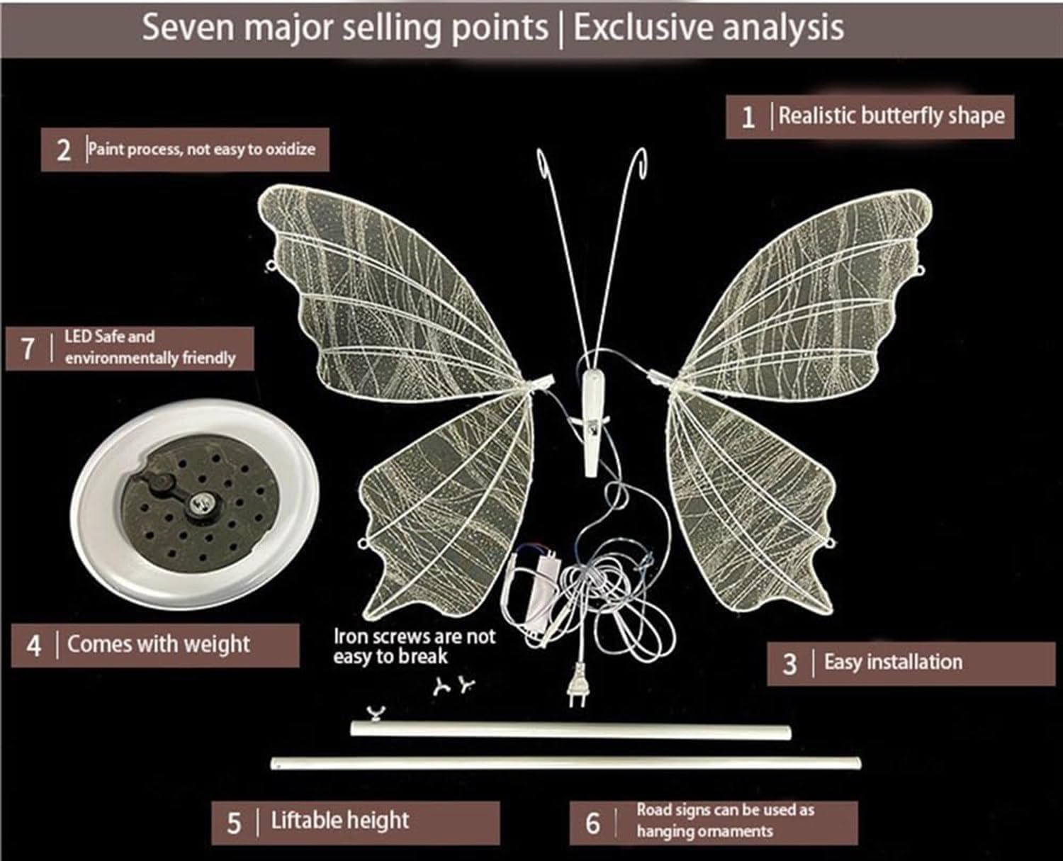❤Specifications:Product Name: Wedding Butterfly Floor LampMaterial: Cloth + Iron Frame + Light StripColor: Gold, WhiteLight Source: Led Gold Yarn White Light / Warm LightLed Silver Yarn White Light / Warm LightStyle: Romantic, Warm, Modern, Elegant❤Butterfly Diameter: 60cm/80cm/100cm/120cm/140cm60cm, Size: 62*62*16cm, 2 Sets/Box, Weight: 7.35kg80cm, Size: 82*82*16cm, 2 Sets/Box, Weight: 8.8kg100cm, Size: 82*82*16cm, 2 Sets/Box, Weight: 10.8kg120cm, Size: 133*68*20cm, 2 Sets/Box, Weight: 12.75kg140cm, Size: 150*90*20cm, 2 Sets/Box, Weight: 13.5kg❤Packing List:2* Wedding Butterfly Floor Lamp❤Warm Tips:1.Please allow 1-2cm difference due to manual measurement.2.Due to light factors, there may be differences between the actual product received and the picture. Please refer to the actual product.