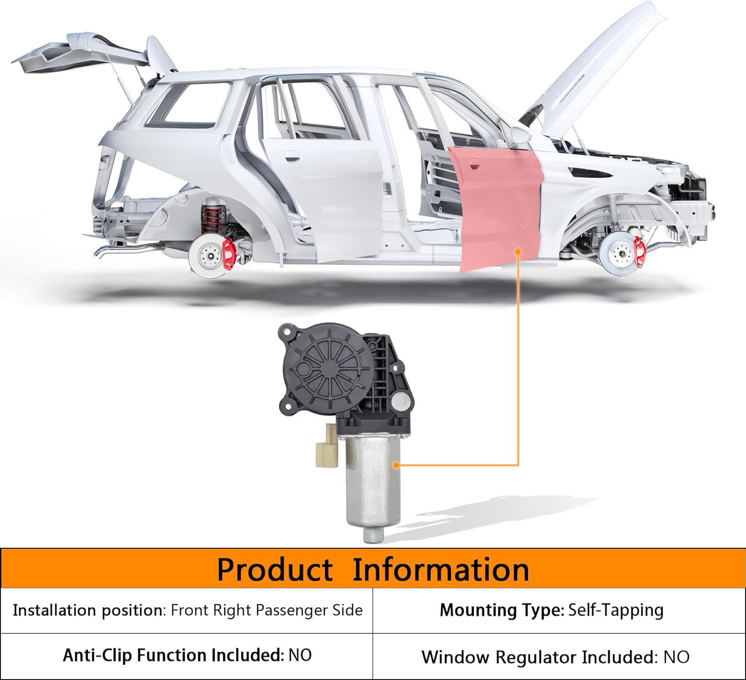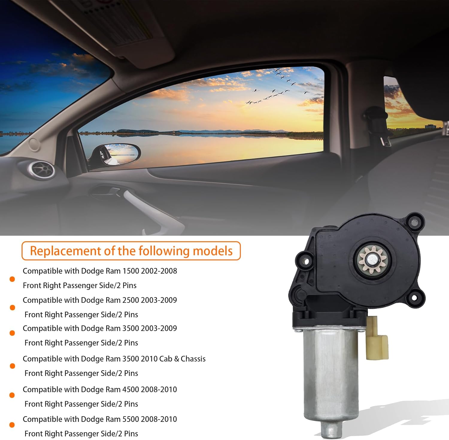 HXHAUTO has extensive experience in power window motor . Through careful design and remanufacturing by our team, we can improve performance and durability while using better materials and efficient technology, so that you can meet the demands of high quality and low cost while shopping happily.Do your Windows not go up or down properly?If your car window have can not lift, pause, weakness, abnormal sound and other problems, may be your Window regulator or window lift motor damage caused by failure, you need to replace in time,this will bring convenience to your life.Product informationAccessories type: Power Window Motor Installation position: Front Right Passenger Side Anti-Clip Function Included:NO Terminal of connector:2 Pins Mounting Type: Self-Tapping Window Regulator Included: NO Quantity Sold: 1 Piece Reference Number:55275598AA 55275598AB 55275598AC 42-472 42-472 742-441Replacement of the following modelsCompatible with Dodge Ram 1500 2002-2008 ---Front Right Passenger Side Compatible with Ram 2500 2003-2009---Front Right Passenger SideCompatible with Ram 3500 2003-2009---Front Right Passenger SideCompatible with Ram 3500 2010 Fit Cab&Chassis Only---Front Right Passenger SideCompatible with Ram 4500 2008-2010---Front Right Passenger SideCompatible with Ram 5500 2008-2010---Front Right Passenger SideTips:Please pay attention to your model, year and installation position before purchase.