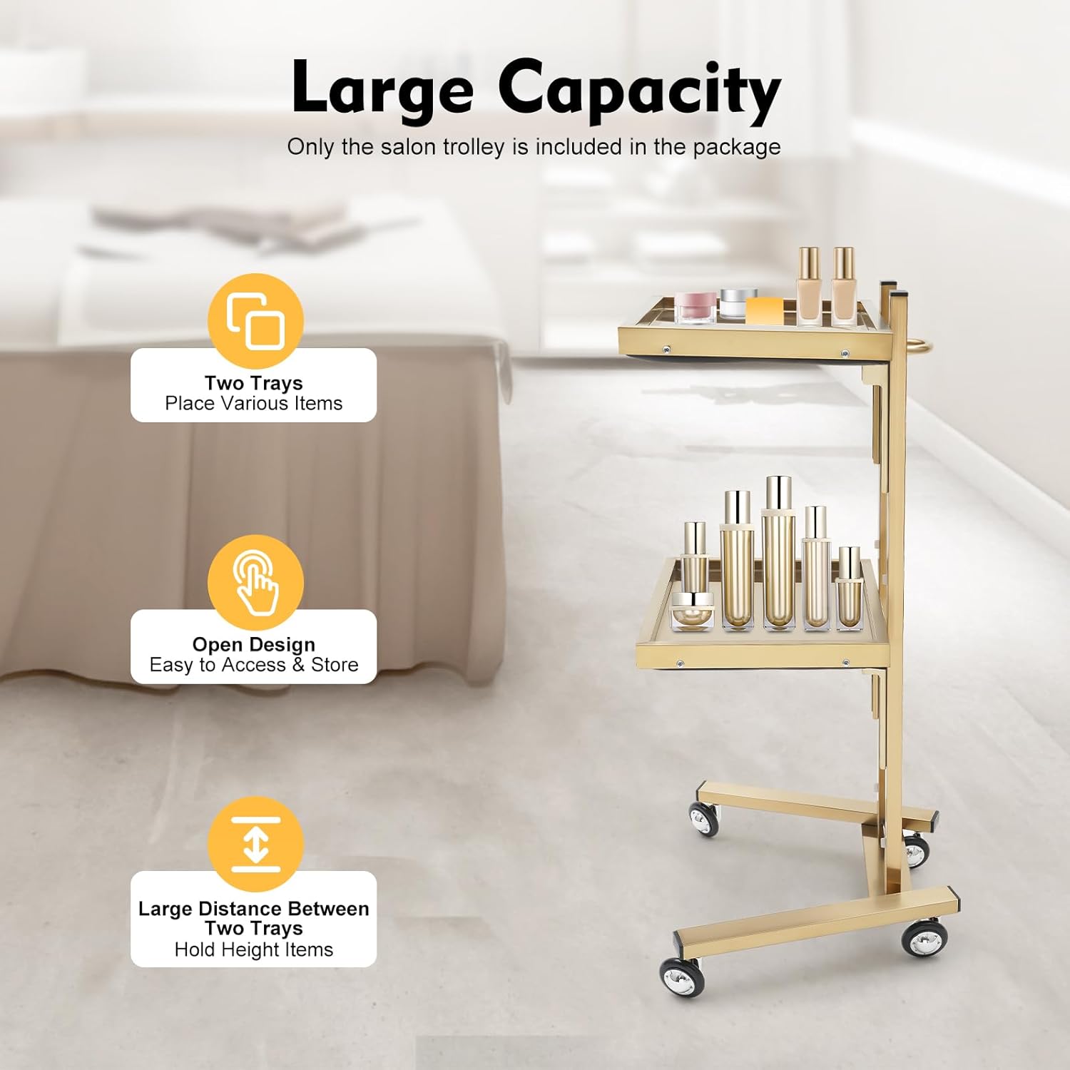DescriptionDo you need a hair salon trolley with plenty of storage space? This product has 2 trays for storing various hairdressing tools and supplies. Premium stainless steel makes this product stronger and less prone to wear or deform. In addition, four wheels allow for easy mobility. If you want to get better at hairdressing, this product is an indispensable helper for you.SpecificationMaterial: Stainless SteelProcess: Brushed, ElectroplatedColor: GoldStyle: ModernTray Shape: RectangularMount Type: Floor StandingAssembly Required: YesNumber of Tiers: 2Total Load-bearing Capacity: 5kg/11.02lbsDistance Between Two Trays: 32.5cm/12.8in (From The Bottom Of The Tray To The Surface Of The Other Tray)Tray Height: 3cm/1.18inProduct Size: 40*30*86cm/15.75*11.8*33.86inPackage Size: 83*44*13cm/32.68*17.32*5.12inGross Weight: 7.1kg/15.65lbsNet Weight: 6.7kg/14.77lbs Package Included1* 2-tier Salon Trolley4* Universal WheelsOther Accessories for AssemblyNotesPlease allow the slight color difference caused by the shooting light and 1-3cm error due to manual measurement and make sure you do not mind before ordering.