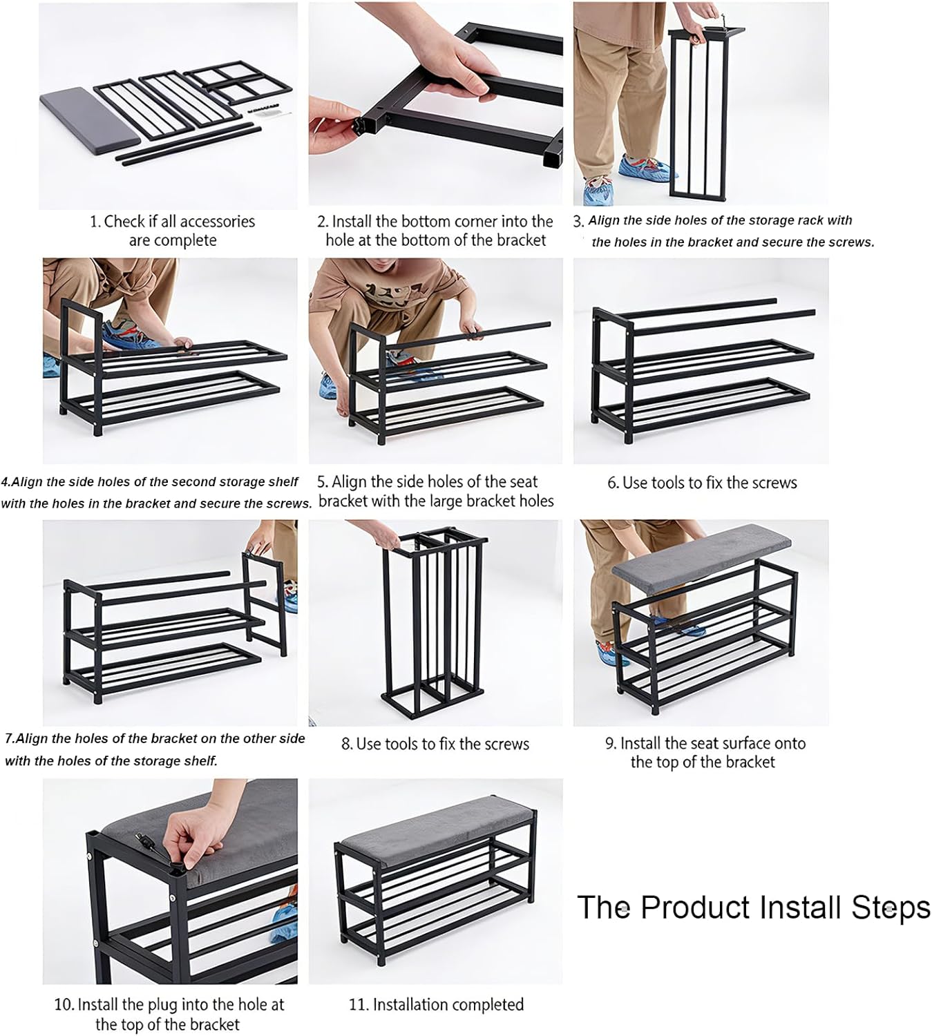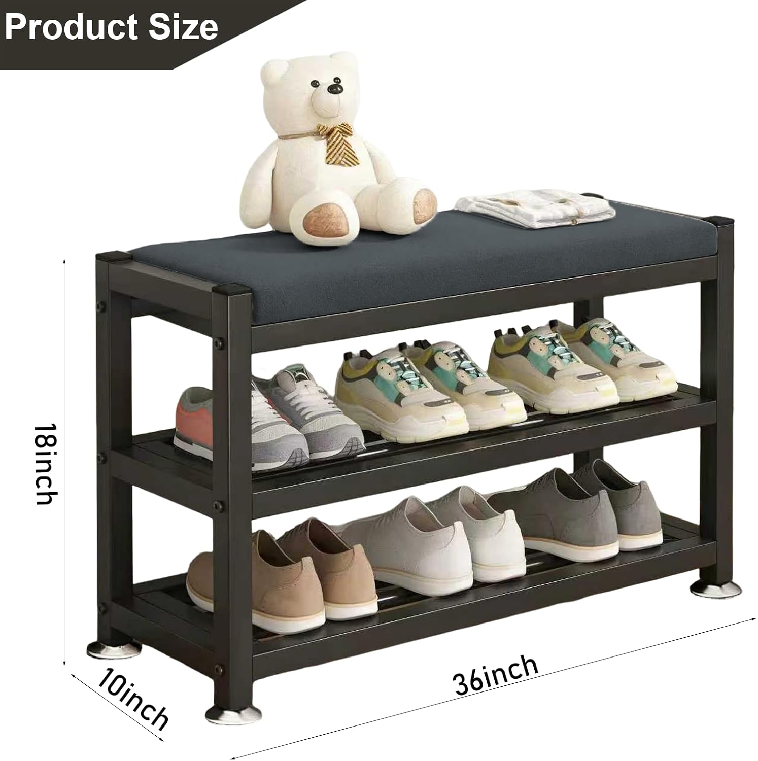 This versatile 2-tier shoe bench combines comfortable seating with practical storage, making it an ideal addition to your entryway, bedroom, or closet. The padded cushion top features elegant tufted upholstery in a sophisticated gray fabric, providing a comfortable spot to sit while putting on or taking off your shoes. The sturdy metal frame in a sleek black finish supports two spacious tiers that can accommodate up to 10 pairs of shoes, helping you keep your footwear organized and easily accessible. Measuring 31.9 inches wide, 12 inches deep, and 19.3 inches high, this space-saving design fits perfectly in compact areas while maximizing storage capacity. The open rack design allows for proper air circulation, helping shoes dry naturally and stay fresh. The durable construction ensures long-lasting performance, while the neutral gray and black color scheme complements a variety of interior styles. Whether you're looking to declutter your entryway or create a functional dressing area, this shoe bench with seat offers the perfect blend of form and function for modern living spaces.