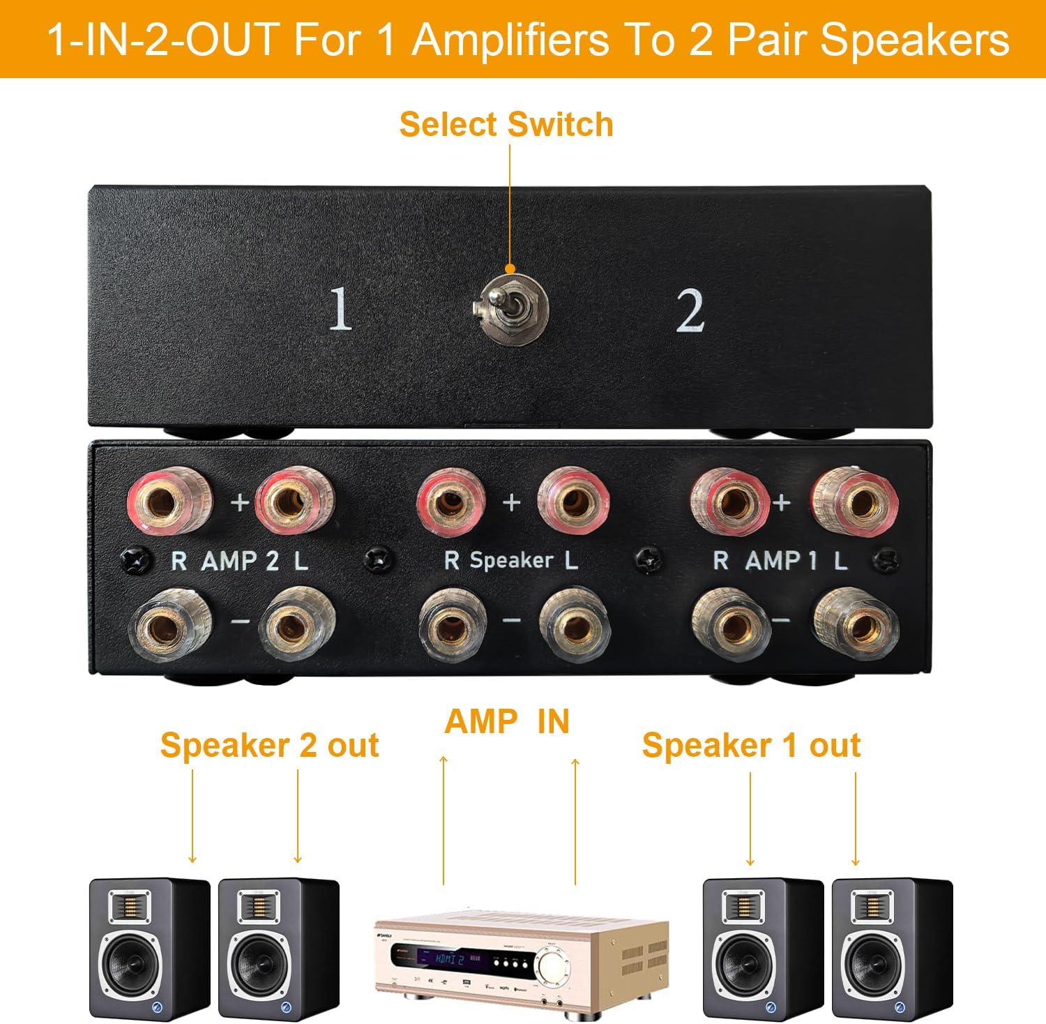 Azduou 2 Way Bidirectional Amplifier Speaker Selector This is a amazing Azduou 2 Way Bidirectional Amplifier Speaker Selector for Amplifiers and Speakers. It is designed for customers having several audio sources and outputs. This is a good solution to the problem of frequent unplugging of speaker wires. USE as Amplifier Switcher: It can easily switch 2 Amplifiers signal sources to 1 Speaker device. USE as Amplifier Splitter: It can also assign 1 Amplifier signal source to 2 Speaker devices, allowing you to switch easily Note: this way is switch one loudspeaker A or loudspeaker B work, 2 Speakers Can't work at the same time Manually Switching Freely switch between your favorite devices without plugging and unplugging. Avoid damage to your Speaker interfaces. No Power Required Plug and play, no extra power required, single push of the button to switch the devices Aluminum Case The robust housing made of high-quality aluminum alloy can dissipate heat quickly and does not adhere to fingerprints. Wildly Compatibility DVD Player, Projector, Camera, Monitor, Television, Gaming Console, Laptop, Personal Computer, Blu-ray Player, Satellite Receiver, Camcorder, VCR, Tablet, DVR Works with Multiple Sizes of Speaker Wire For use with 12AWG to 18AWG speaker wire NOTES No protection or impedance matching circuits internal, so could not affect sound quality If you have any questions, please contact customer service, we will do our best to provide you with satisfactory after-sales service support. In the Box 1* Amplifier Speaker Selector