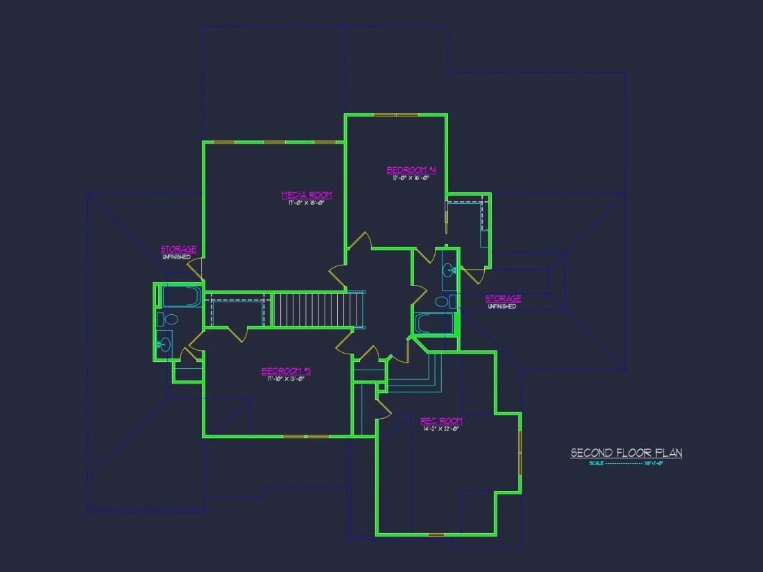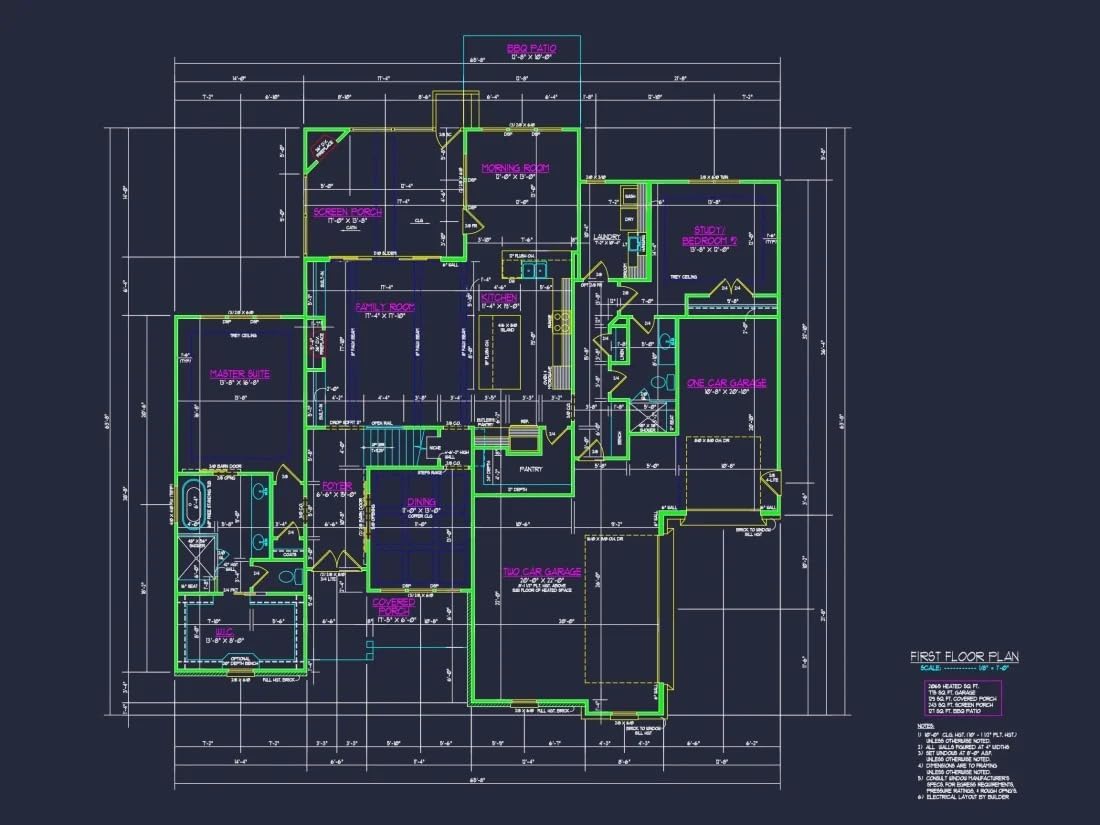 Width: 65′-8″Depth: 63′-8″Htd SF: 3,475Unhtd SF: 608Modern Craftsman Home Floor Plan with 2 Stories & Detailed CAD DesignsExplore this stunning 3,475 sq. ft. Modern Craftsman house plan featuring 4 bedrooms, a BBQ patio, open living, and detailed CAD blueprints—perfect for stylish and efficient building.This Modern Craftsman house plan offers a perfect mix of comfort and functionality. Designed for modern living, it delivers timeless charm and smart space planning.Key Features of the Home PlanLiving Areas - Heated & UnheatedHeated area: 3,475 sq. ft. over two stories.Unheated extras: Covered front porch, screened porch, BBQ patio, and 3-car garage with storage.Bedrooms & Bathrooms4 total bedrooms, including a first-floor Owner Suite with private en-suite and walk-in closet.3 full bathrooms spread across both floors for easy access and privacy.Interior Highlights10-foot ceilings create volume and architectural elegance.Open floor plan connects kitchen, family room, and breakfast nook seamlessly. View open layouts.Kitchen island and breakfast nook add daily functionality and charm.Recreational and media rooms offer entertainment space on the second floor.Dedicated study/office for working from home or school projects.Spacious laundry room with built-in storage.Garage & Storage DetailsGarage Bays: 3-car garage for vehicles, hobbies, or storage.Garage Type: Attached garage with direct access to the house.Storage: Bonus unfinished storage space above garage plus mudroom cubbies.Outdoor Living FeaturesCovered front porch and rear screened porch for seasonal enjoyment.BBQ patio off the breakfast area, perfect for grilling and entertaining.Brick and siding exterior with elegant Craftsman detailing for curb appeal.Architectural Style: Modern CraftsmanThis design blends timeless materials and thoughtful details—perfect for families who value character and efficiency in one