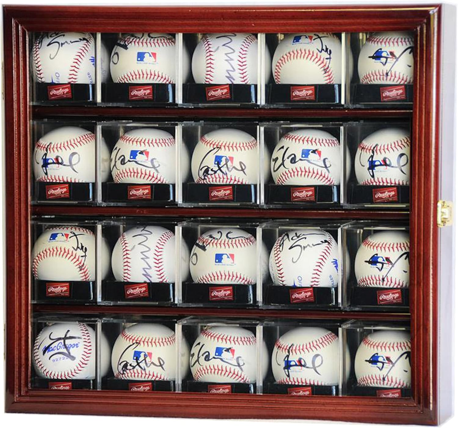 Hand-made from imported Australian beech wood. This furniture-grade 20 Baseball Acrylic Cubes Display Case is of beautiful design and construction, very detailed and attractive, but also very affordable. The perfect way to display the memorable balls that you have collected. This unique display case features a black felt fabric background that creates a stunning contrast with your baseball ball. The case comes with a 98% UV Coated plexiglass door to protect your balls from fading. A must-have! The display case is completed with brass hinges, door latch, and installed heavy-duty wall hanging hardware (balls and acrylic cubes are not included).
