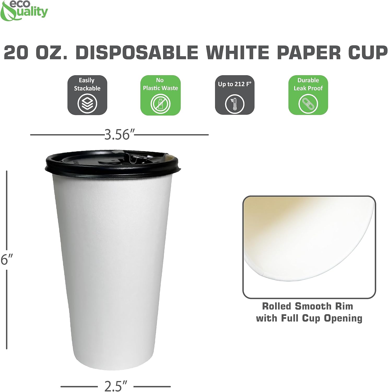 • CONVENIENCE: Our white 20oz coffee cups with rolled rims are made for comfortable drinking. EcoQuality disposable paper cups with lids can be used with any hot or cold drinks and make great for serving coffee, tea, espresso and hot chocolate. Disposable hot paper cups can then be thrown directly into your recycling bin after each use-saving time and cleaning!