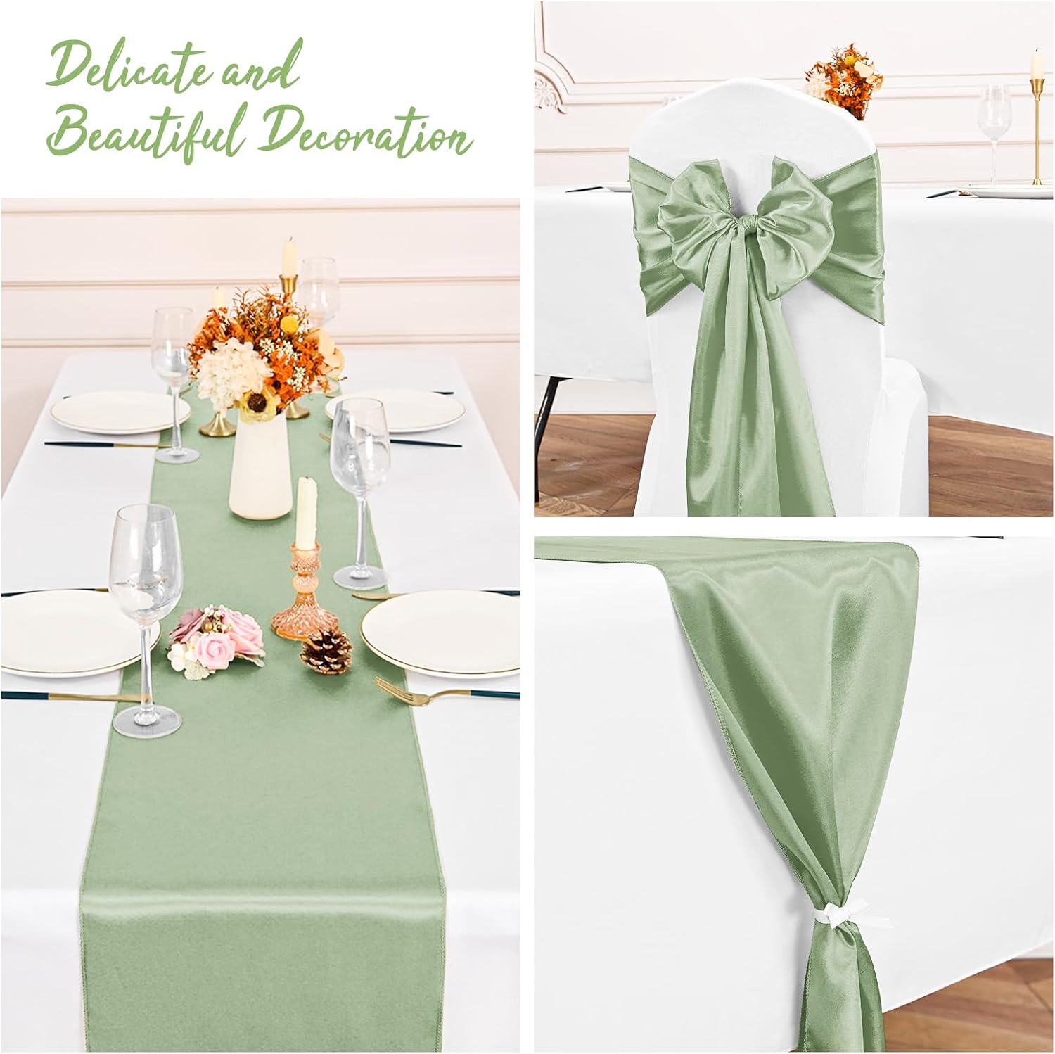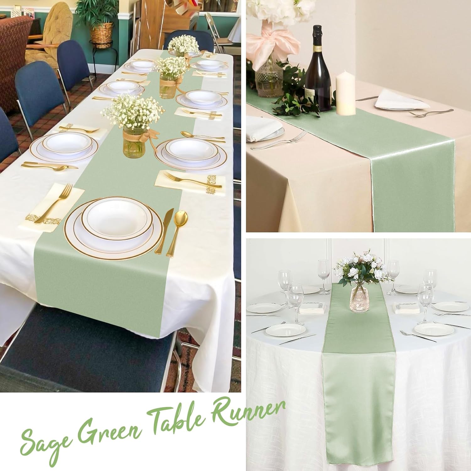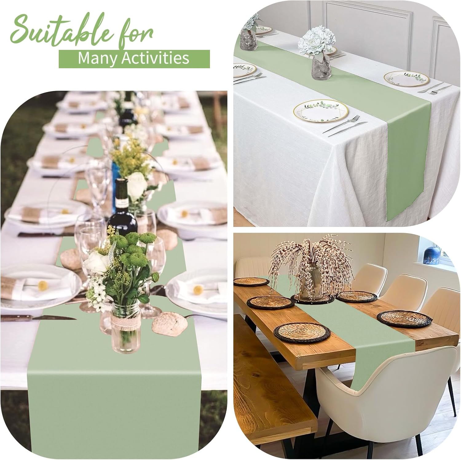 Product DescriptionFeature:Made of satin fabrics that people like, it is not easy to fade, can be reused and has a soft and smooth touch. It has good workmanship, clean seams and is not easy to damage. Suitable for round tables and rectangular tables, silk table runners for 8-12 people, have a variety of uses and can be used as home decoration, weddings, indoor and outdoor banquets. Classic, stylish wedding table runner will make your event elegant and memorable.Specification:Material: Polyester, SilkColor: Sage GreenPackage includes: 20 Pack Sage Green Satin Table RunnerDimensions: 12 x 108 inch/30 x 275cmOur Service:24 hours online customer serviceIf you have any unsatisfactory experience, we will serve you and help you solve the problem well.Notes:Due to manual measurement, allow for slight dimensional deviations that may inevitably existThe colors may vary slightly due to lights and screen displays.