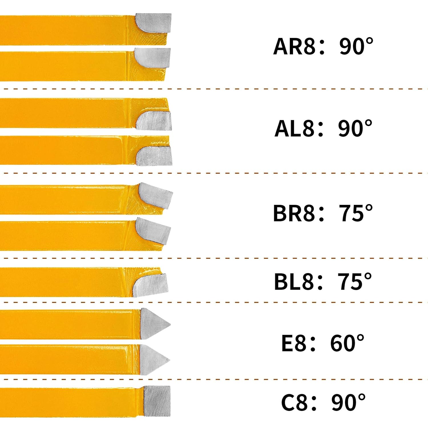 Carbide Lathe Tool Bits are good choice of carbide lathe tool bitsUsing high quality cemented carbide which has good toughness.Application:Suitable for ordinary lathe and CNC lathe, Suitable for ordinary lathe and CNC latheSpecification:Tip Material: Cemented Carbide YT 5Body Material: 45 #Cutting Width: 0.5"x 0.5"Processing Material : The C6 set is machining steel parts and the C2 set is machining iron parts.Model Included: 2 x AR8 ; 2 x AL8 ; 2 x BR8 ; 1 x BL8 ; 2 x E 8 ; 1 x C8.Cut Degree: AR8(90°), AL8(90°), BR8(75°), BL8(75°), E8(60°) ,C8(90°)Package content20 Pcs x Carbide Tip Tipped Cutter Tool