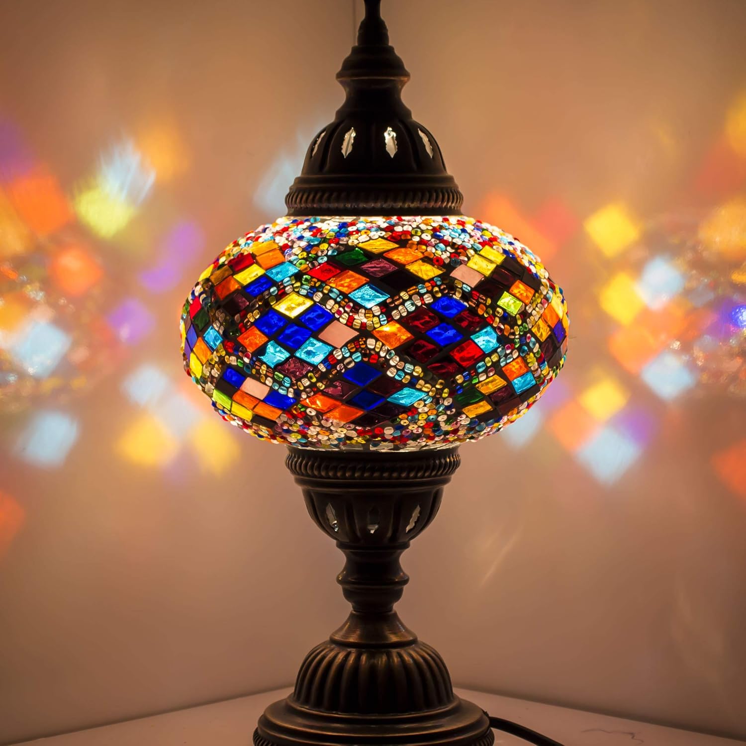 Turkish Moroccan Mosaic Lamp Light, Turkish Lamp, Handmade Mosaic Glass Swan Neck Table Lamp -Tiffany Style Bohemian Colorful Mosaic Bedside Night Lampwith Led BulbSPECIFICATIONS Materials: Glass, MetalHeight: 17.3" (44 cm) tall, with a 6" (15 cm) bottom base diameterWidth: 6.7" (17 cm) in diameter hand-blown glass large globe Turkish Lamps has a vast collection of authentic style mosaic lamps inspired by the rich and artistic history of Anatolian Civilizations.Beautiful and elegant handmade Turkish Mosaic Table Lamp that changes the whole mood of your living area once switched on and is very complementing to any decor. The lamp shade is handmade in Turkey, the glass is NOT painted at all. each mosaic glass pieces have been carefully glued on to the real glass lamp. The beauty of our lamps comes from a combination of expert craftsmanship, quality materials and centuries of tradition from Anatolia. Our collection consists of different coloured with an exquisite mosaic pattern that encircles the glass globe. The calming, serene tones and mirror-cut mosaics from our lamps will add the perfect ambiance to your room. The Turkish Handmade Mosaic Table Lamp has a great size. It comes with a LED bulb and electric wire.It is stunning as a table or bedside lamp. The glass is colored stained glass throughout and designed not to fade. It is uniquely crafted by making use of precision cut pieces to produce unique and stunning designs.The metalwork is in good quality that will not discolour or rust. We can assure you will have a stunning mosaic lamp that is unique in the world. Professional customer service, If you have any problems, please let us know. We will resolve your problems immediately.