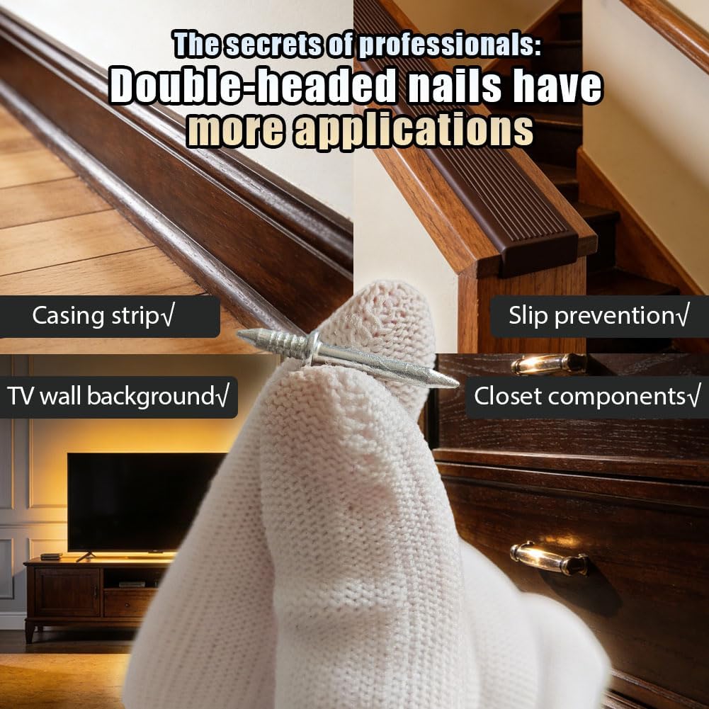 Specification:Product Name: Sutfmwe Double Headed Skirting NailsMaterial: Alloy steel materialProduct Dimensions: Nail: 1.06" (27mm) L x 0.196" (5mm) DiaColor: SilverSuitable For: Baseboard / Skirting Board Installation, Trim Work, Solid Wood, MDF, Furniture, Cabinets, etc.Package Includes:200 x Double Headed Skirting NailsSleeve Installation ToolsNote:Please confirm the size and application before making the purchase to ensure the best results for your project.Due to different monitor displays and lighting effects, the actual color of the item may vary slightly from the images. Thank you for your understanding.————————————————————————————————Craft a Flawless, Invisible Finish: The Smarter Way to Install TrimTired of staring at those pesky nail holes after a DIY project? Frustrated by the tedious cycle of filling, sanding, and repainting just to hide the evidence of your hard work? Traditional nailing can leave your beautiful trim work looking less than perfect. Now, imagine achieving a seamless, professional finish with no visible marks, no holes to fill, and no touch-up paint required. Introducing Sutfmwe Double Headed Skirting Nails—the ingenious fastener designed for perfectionists who value a clean, unblemished look.The Secret to a Truly Invisible InstallationOur double-headed skirting nails are engineered to disappear. Unlike conventional nails or screws, our innovative design allows the fastener to be completely concealed withinthe joint between your wall and trim. Once installed, all you see is a perfect, continuous line. This means a no-mark, invisible finish that elevates the appearance of your baseboards, door frames, crown molding, and panel walls. Say goodbye to visible fasteners and hello to a sleek, professional outcome that looks like it was done by a master carpenter.Easy DIY Installation: Your Time Saved, Your Effort MinimizedForget renting heavy, expensive nail guns or struggling with complex tools. We’ve simplified skirting board installation for everyone. Each kit includes a specialized sleeve tool that makes the process foolproof. The steps are as simple as: 1) Insert the nail, 2) Tap it into the wall, 3) Align your trim, and 4) Press it on. It’s an easy installation process that requires no electric drill, making it the perfect DIY solution for securing baseboards and trim. Achieve stunning results with minimal effort and no special skills.Engineered for a Strong, Lasting Hold on Wood & MDFWe understand that an invisible finish means nothing if it doesn’t last. Constructed from Alloy steel material, these double pointed nails provide a strong grip and sturdy connection. They are specifically designed to create a secure, reliable hold in solid wood and MDF—the most common materials for modern trim and furniture. This ensures your skirting boards, cabinets, and wardrobe installations remain firmly in place for years to come.Versatile & Complete Kit for Your ProjectsThis isn't just a niche tool. It's a versatile fastener for countless interior decoration tasks. Use our hidden nails for:Skirting Boards & Baseboards: The primary use for a perfect, seamless finish.Door & Window Frames: Attach trim cleanly without damaging visible surfaces.Panel Walls & TV Backgrounds: Create feature walls with invisible fixings.Cabinets, Drawers & Furniture: Ideal for discreet assembly and repairs.Your purchase includes a complete 200-nail kit with sleeve tools, offering tremendous value and ensuring you have enough for multiple rooms or projects.Your Guide to Successful Application: Designed for SuccessTo ensure you achieve the advertised, professional results, please note: These double-sided nails for trim are engineered to work best when fastening trim materials (Solid Wood, MDF, PVC) into a solid backing (wall studs/plates). For optimal performance, we recommend using them where the wall material (e.g., wood stud) offers similar or greater density than the trim being attached. This ensures the nail achieves maximum hold. They are the perfect alternative for a skirting board installation without a nail gun, providing a clean, hole-free result.