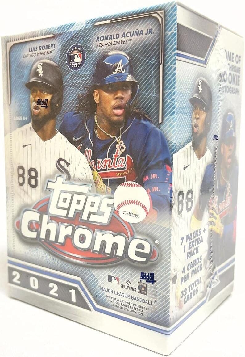 Product Highlights New Inserts such as Beisbol and Prismic Power! Look For Autographs! Find NEW! 1986 Topps Chrome Inserts! Collect Dual Rookie Autographs! Two Sepia and Two Pink Refractor Parallels Per Box! Find Two Sepia and Two Pink Refractor Parallels Per Box! 2021 Topps Chrome Baseball comes out swinging with another hot year of chromed Baseball cards, including a variety of color parallels and chrome autographs. Build the entire 200-card Base Set and be sure to stock up on all-new inserts such as Beisbol and Prismic Power!