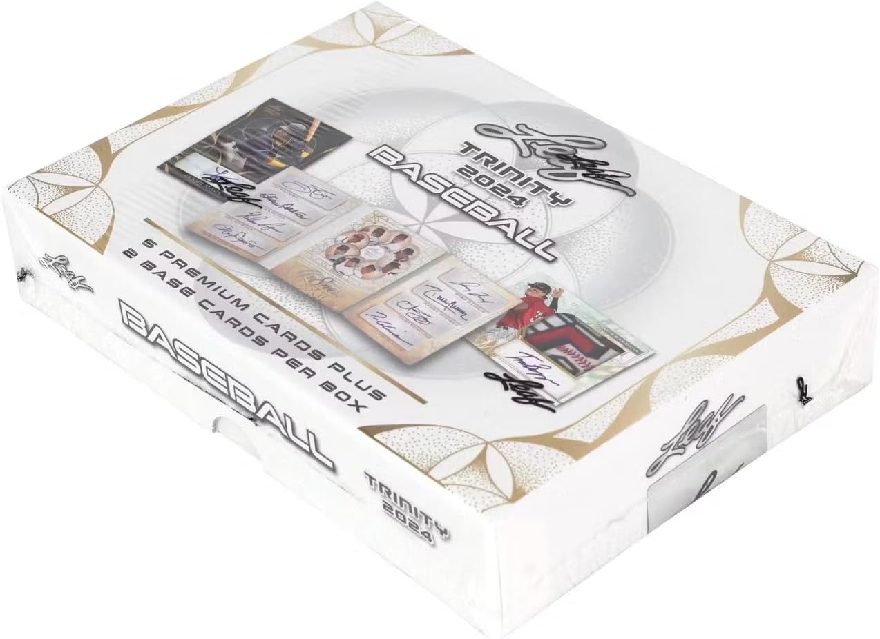 2024 Leaf Trinity Baseball Hobby Box Each Box contains Six Autograph Cards and Two Base Cards Numbered to 49 or less!2024 Leaf Trinity Baseball is back and brings you six premium autograph and memorabilia cards in every box! The hobby's most popular baseball brand returns with amazing Trinity Autographs, Clear Autographs and Steel Autographs!Collectors will find an amazing autograph checklist of former baseball greats, current superstars, and the top NIL names from college and high school.The Cycle autograph single, dual, triple, and jumbo memorabilia set returns with new veteran game worn memorabilia cards featuring players such as Bo Jackson, Nolan Ryan, Carl Yastrzemski and many more!Find autographs of baseball's hottest prospects including Travis Bazzana, Charlie Condon, Jace LaViolette, Leodalis De Vries, Roman Anthony, and many more!Once again, Trinity will bring you an outstanding selection of autograph memorabilia cards with Patch Autographs, Logo Autographs and the eye-catching The Cycle set!You can find incredible short printed autograph cards in the Divinity set, as well as amazing combinations in the Dual and Triple Autograph sets!Brand new for 2024 Leaf Trinity Baseball, you can find Booklet cards featuring jumbo dual memorabilia and auto memorabilia with Double Booked, and 8 player autographs in the Gr8ness and Future Gr8ness sets!Look for brand new booklet cards featuring dual jumbo patches or 8 player autographs!Configuration: 6 Cards per Box