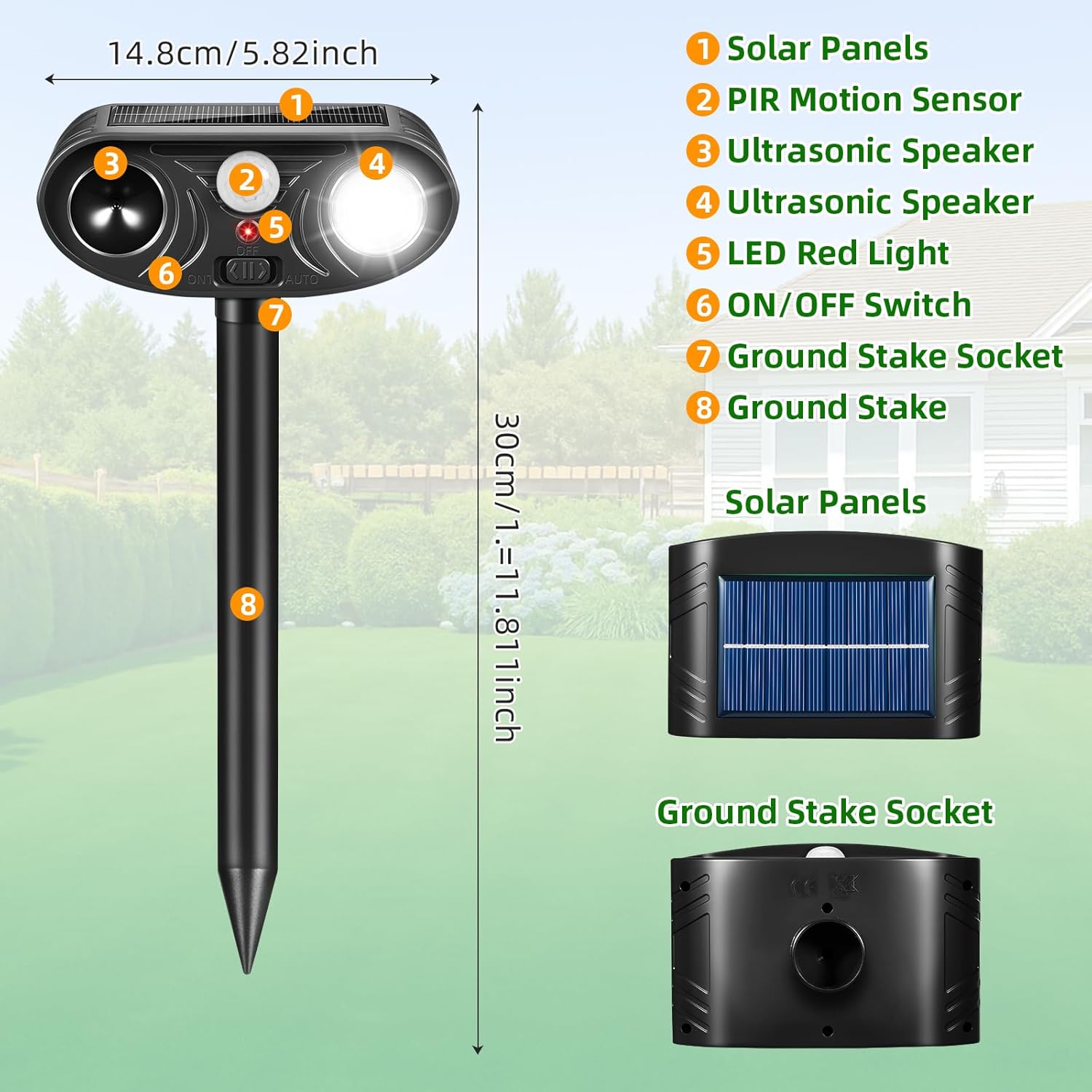 • 【Easy Setup & Maintenance-Free Operation】 Ready to use in minutes! Simply stake this bear repellent into a sunny spot. It works as a "set-and-forget" animal control outdoor device. Whether you need a racoon repellent outdoor or a skunk repellent for yard, this 2-pack provides comprehensive coverage, ensuring your outdoor living space stays peaceful and pest-free.