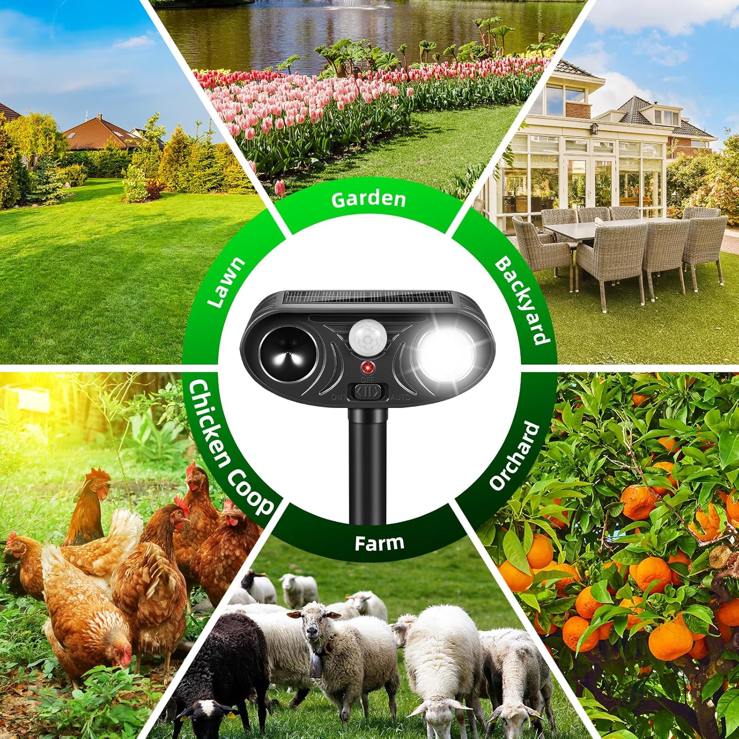 • 【Effective Multi-Animal Control】 Tired of garden intruders? Our 2026 upgraded ultrasonic animal repellent uses smart variable frequency waves and intense strobe lights to disrupt the nervous systems of pests. This dual-action system acts as a powerful squirrel repellent and deer repellent, effectively scaring away raccoons, skunks, and rabbits before they can damage your plants.