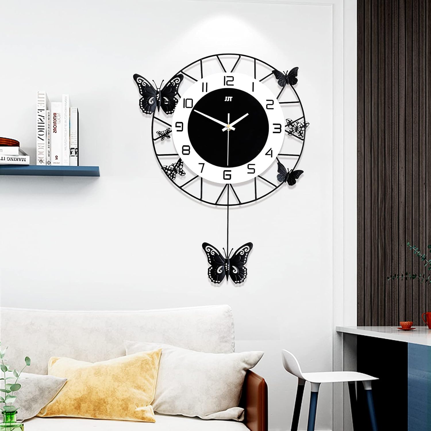 ApplicationIt is suitable for use as a wall clock and wall decoration in bedrooms, dining rooms, living rooms, entrances, offices, hotels, classrooms, cafes, meeting rooms, corridors, study rooms, hallways, exhibition halls, foyers, bars, stores, kitchens, restaurants, and so on.SpecificationsStyle: ModernColor: BlackShape: ButterflyMaterial: Iron, Aluminum, MDFProcess: High-temperature Baking PaintIndoor/Outdoor Usage: IndoorAssembly Required: YesMounting Type: Wall MountedMovement: Silent Sweep Second MovementClock Battey Type: 2*AA 1.5 Batteries(Not Included)Gross Weight: 1.22kg/2.68lbsNet Weight: 1.16kg/2.55lbsProduct Size: 50*33cm/20*13inchDial Diameter: 24cm/9.5inchPackage Size: 46*47*9cm/18.11*18.5*3.54inchPackage Included1* Wall ClockOther Accessories for AssemblyNotesPlease allow the slight color difference caused by the shooting light and 1-3 cm error due to manual measurement, and make sure you do not mind before ordering.